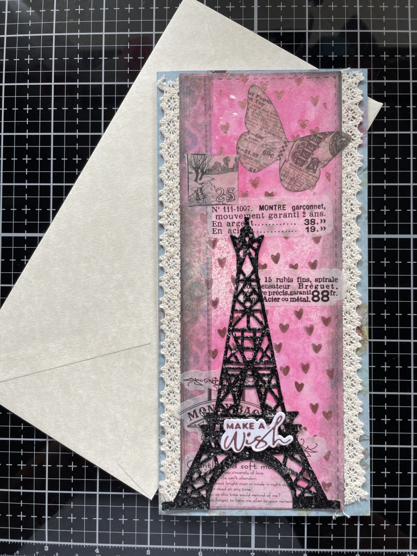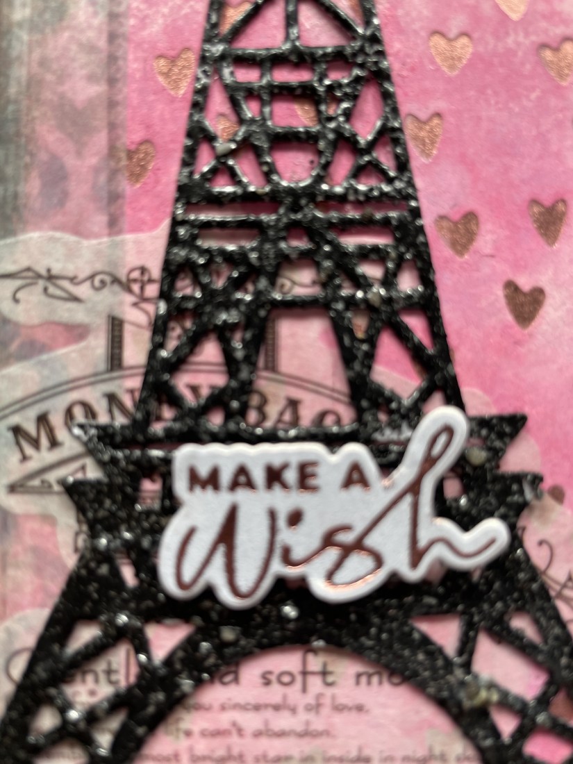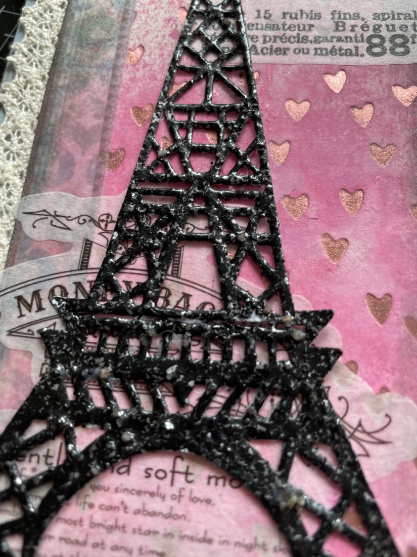 You might remember from my last post that I designed and then cut out my Eiffel Tower using my Cricut Maker. This time I used a large one as I cut out two sizes. I applied a generous amount of embossing glue and then using Rocky Road embossing powder from Emerald Creek applied a coat onto the cut out and heated it. I repeated this once more ensuring I had a nice thick layer. I just loved the amount of texture and gloss it created.
