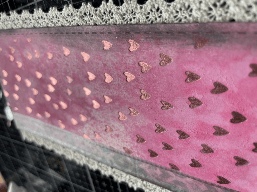 So this simple looking card started with a slimline stitched die being used on Distress mixed media card by Ranger. I then added the glimmered hearts using Spellbinders hot glimmer system. I applied both distress oxide and ink in Kitch Flamingo to the cut card, then edged the card with Walnut stain distress ink to age it slightly.