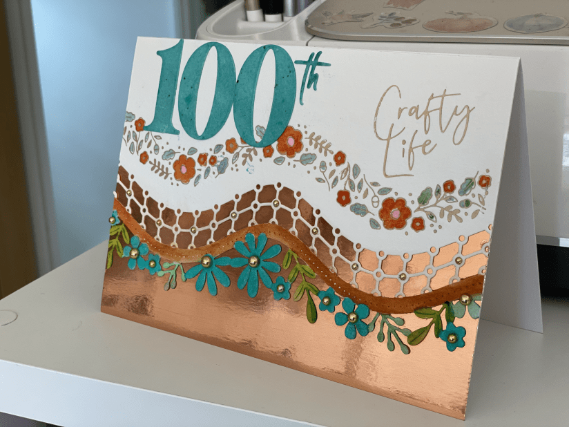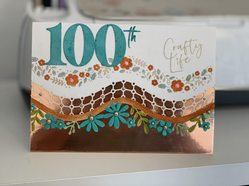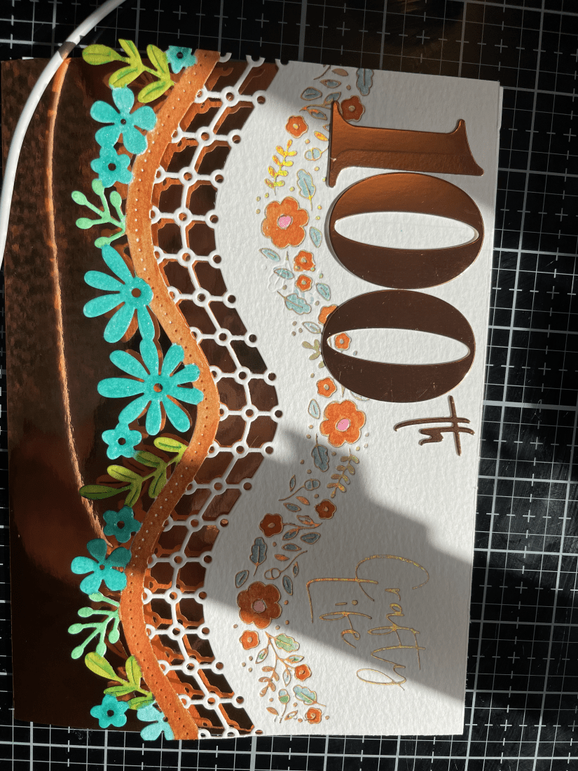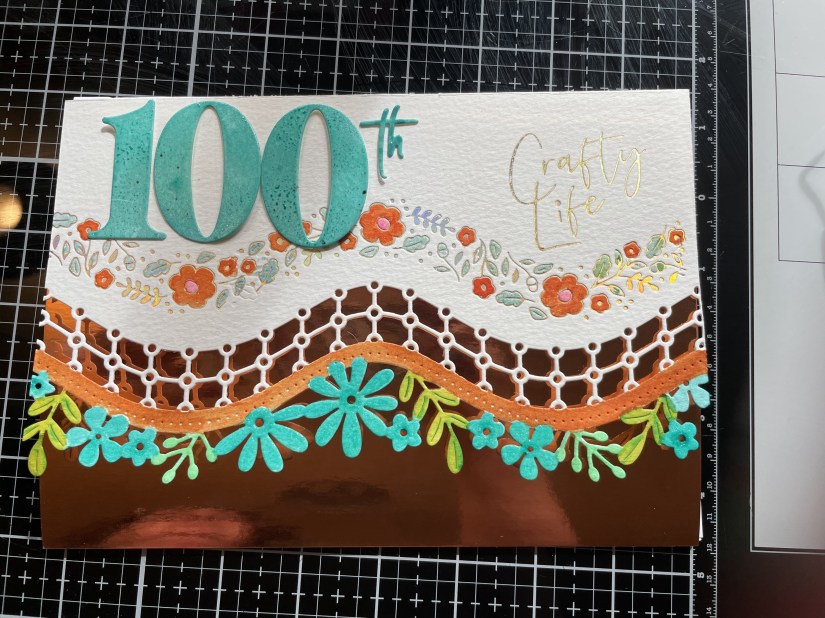 I cut two sets of 100s from a die from Spellbinders and one in the same gold as I was going to use at the bottom of the card and one in watercolour paper and painted it with the same blue.