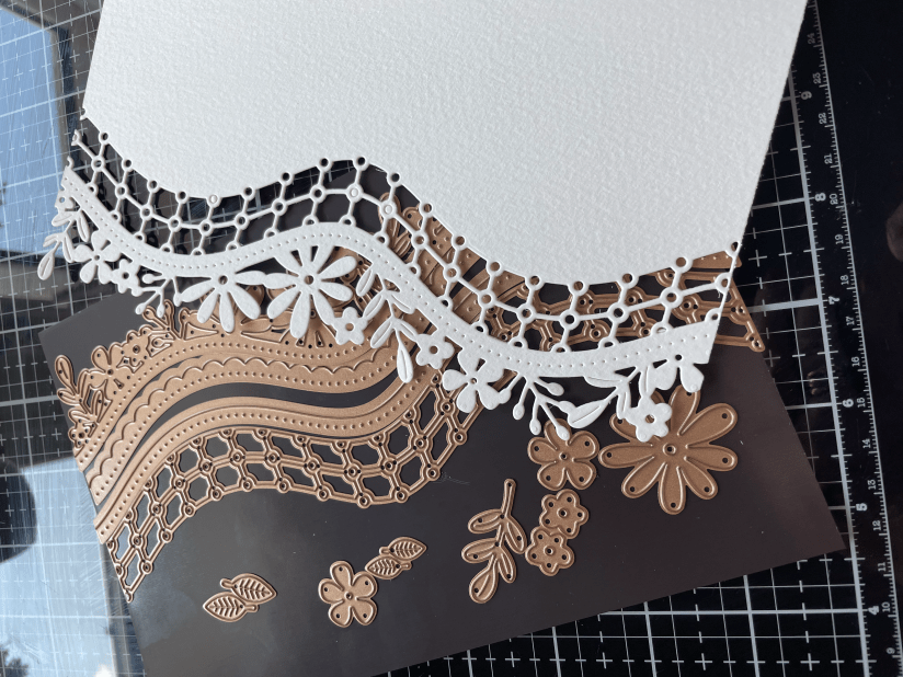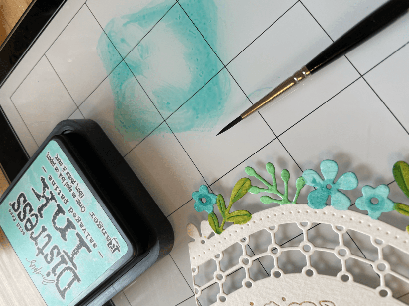 So I started by die cutting the panel which is from Spellbinders. I coloured the flowers using two new colours from Ranger in their distress ink range.
