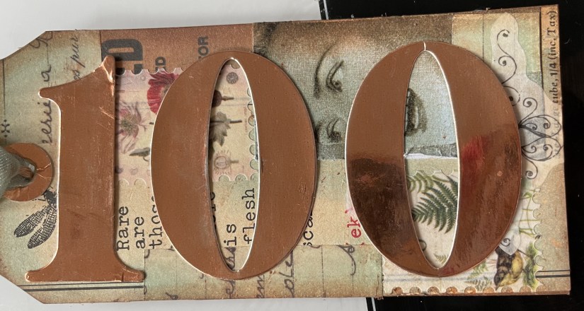 I edged the tag in ink and then added some ribbon. Finally, as I have no number stamps I used Walnut ink and a two different kinds of dip pens I added my 100s on the page. lets take a final look.