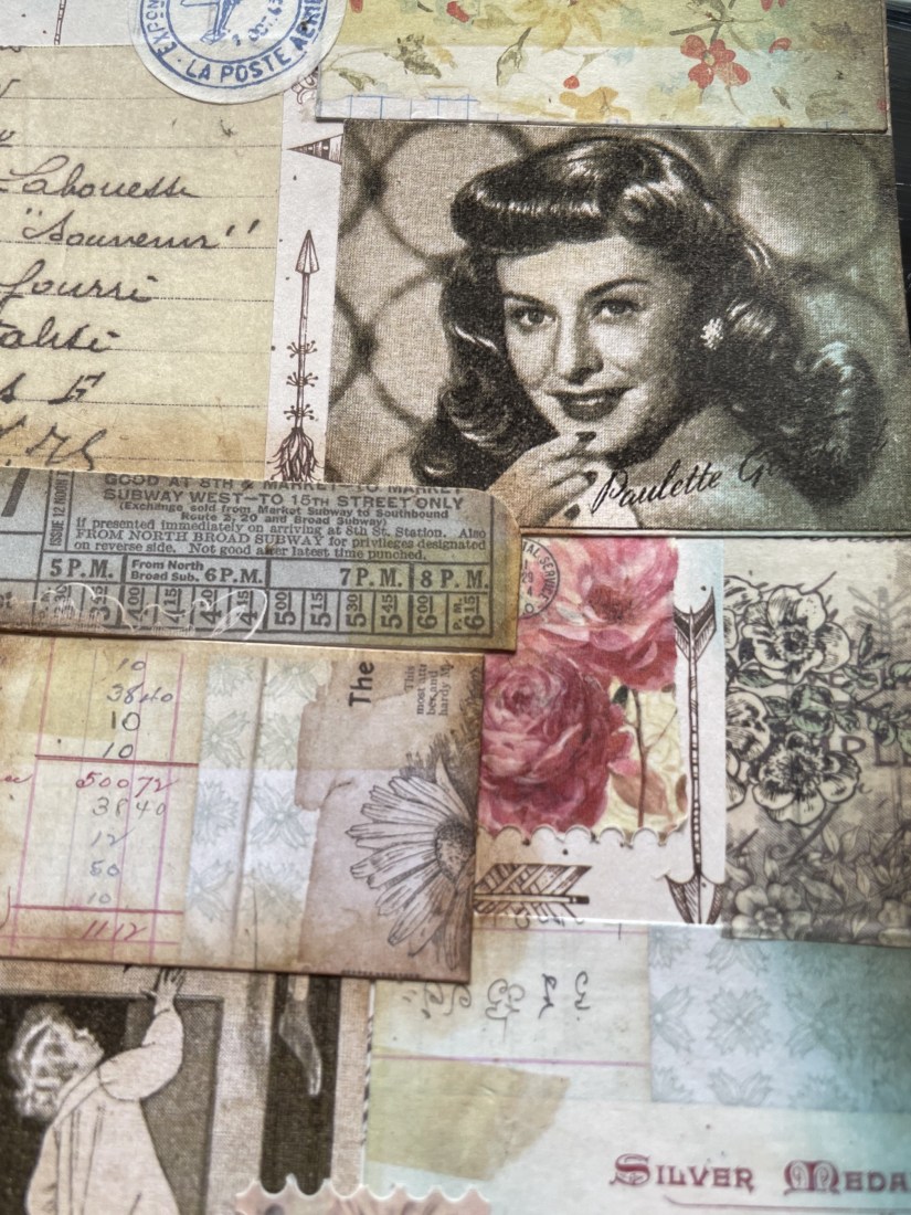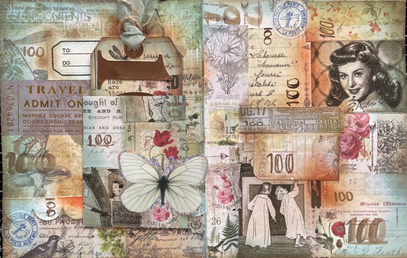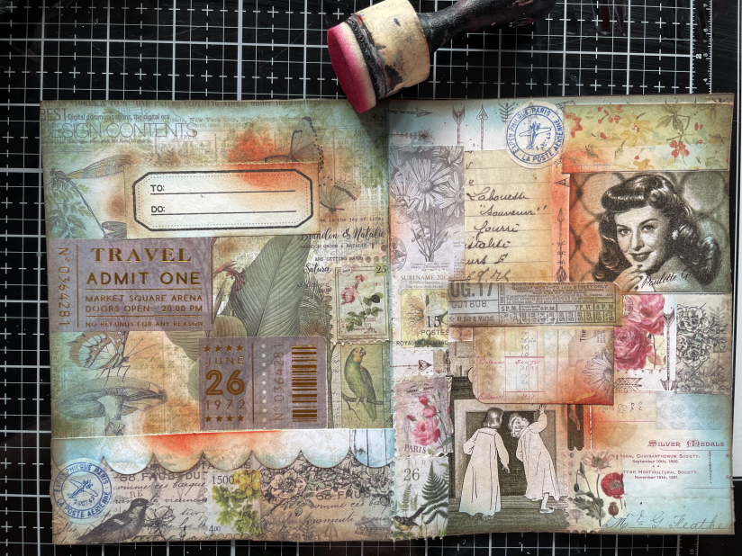 you can see below that I used a mix of tickets, adverts flowers birds and writing all with a vintage feel.once everything was stuck down and dry I added ink in places to add interest.