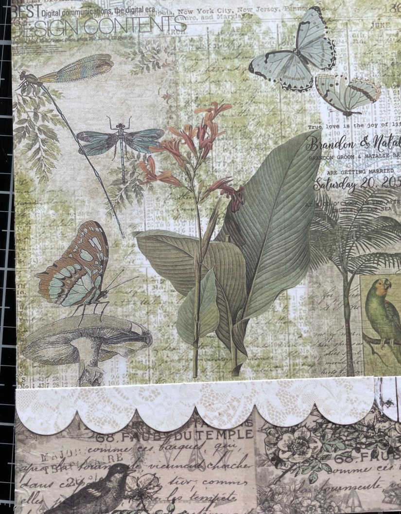 I decided I wanted to use a pocket to house a tag so set about creating the tag using the same method of cutting and sticking chosen pieces which have been inked. I chose a large butterfly to bring the page and pocket together.