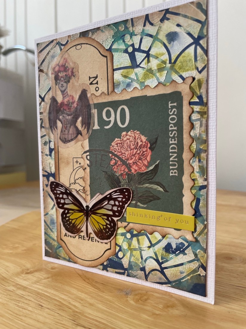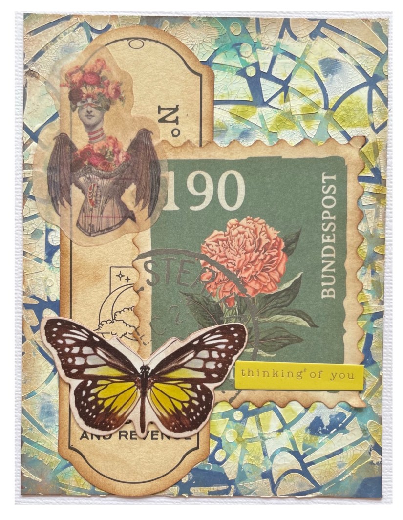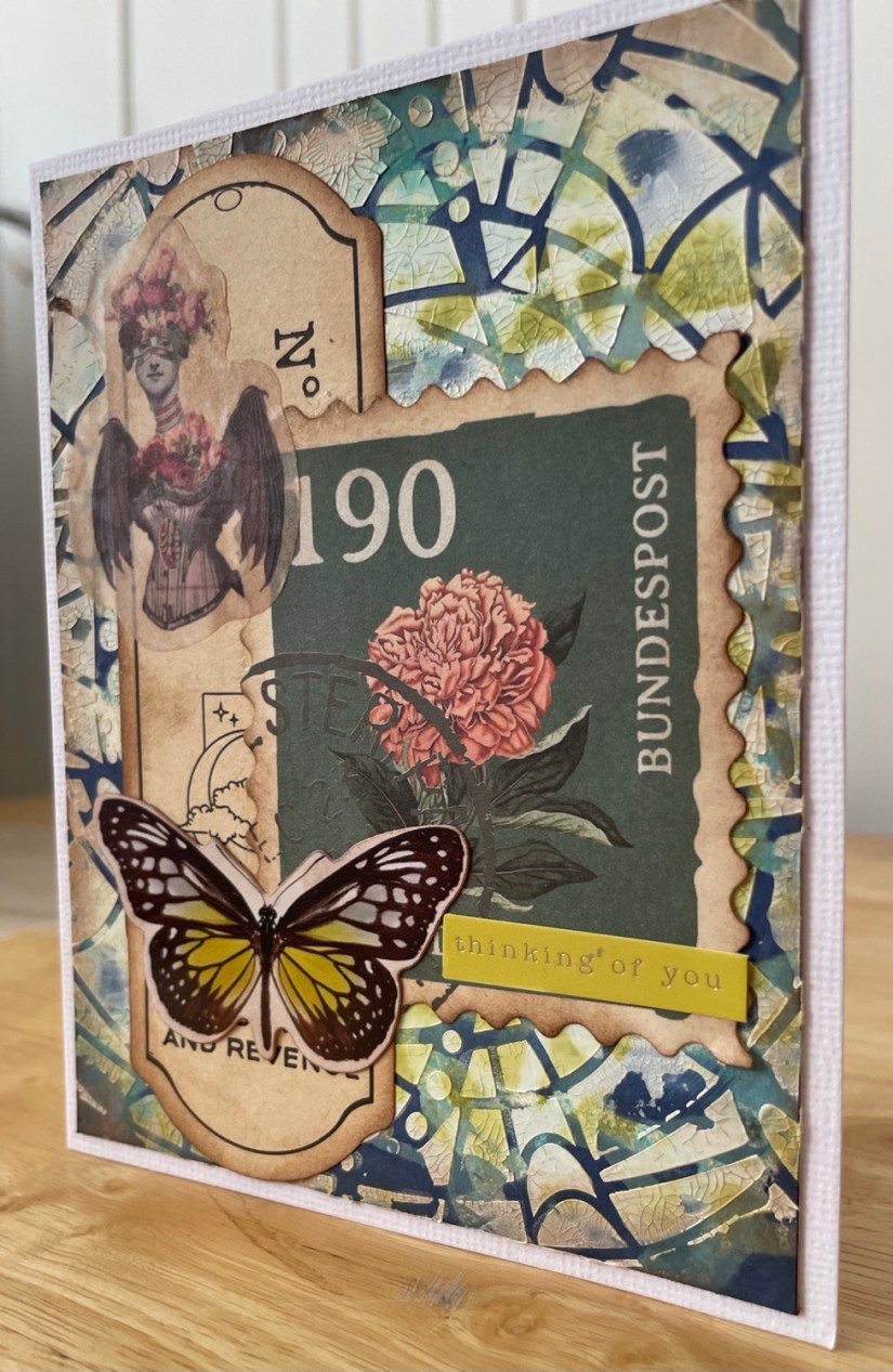 I placed it central on my background and using crackle paste added a generous coat. I loved how the colours seeped up through the paste in areas tying it all together. I chose a few bits of ephemera, and a sentiment which I edged with Walnut Stain ink.