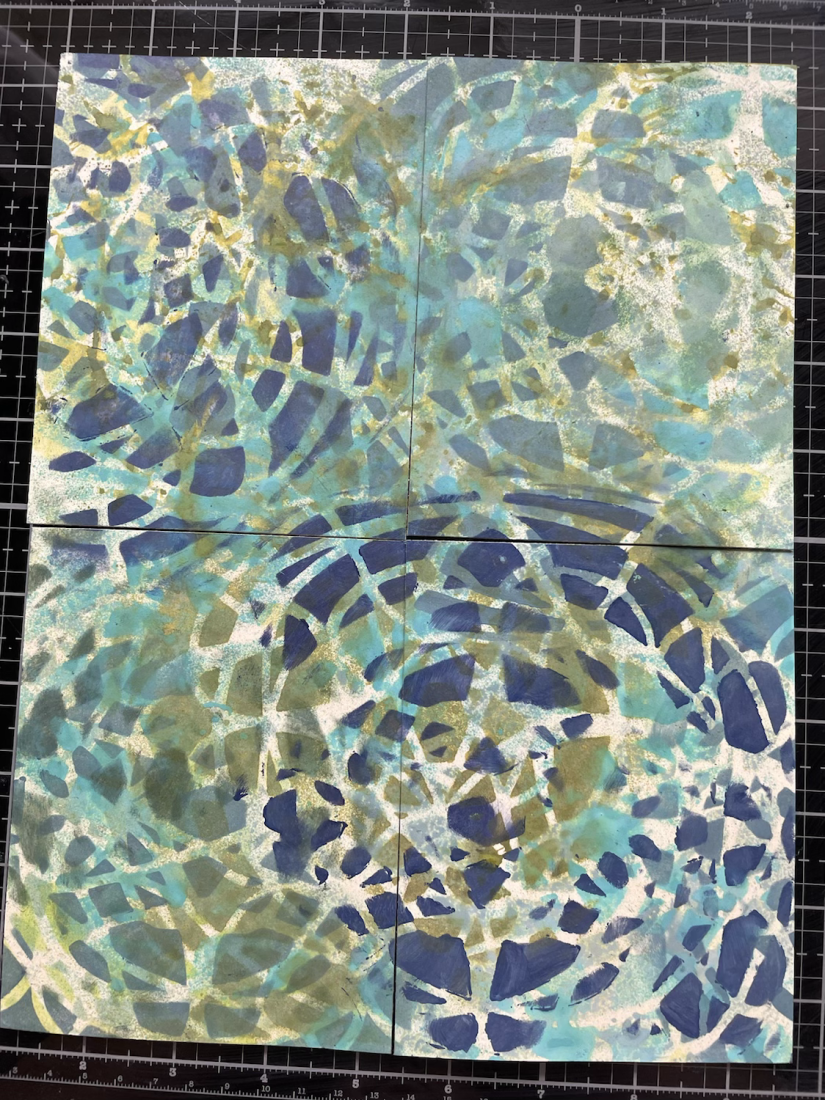 I used several shades of green and blue acrylic paints my Dina Wakley for Ranger, and then some versafine inks. I cut it into 4 to use as backgrounds for cards.