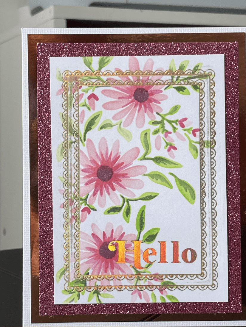 I trimmed out the damaged card which made for a smaller card than I first anticipated, but it was salvageable. Moving on I thought some foiled elements would look nice so got out my glimmer machine by Spellbinders and chose which plates I wanted to use.
