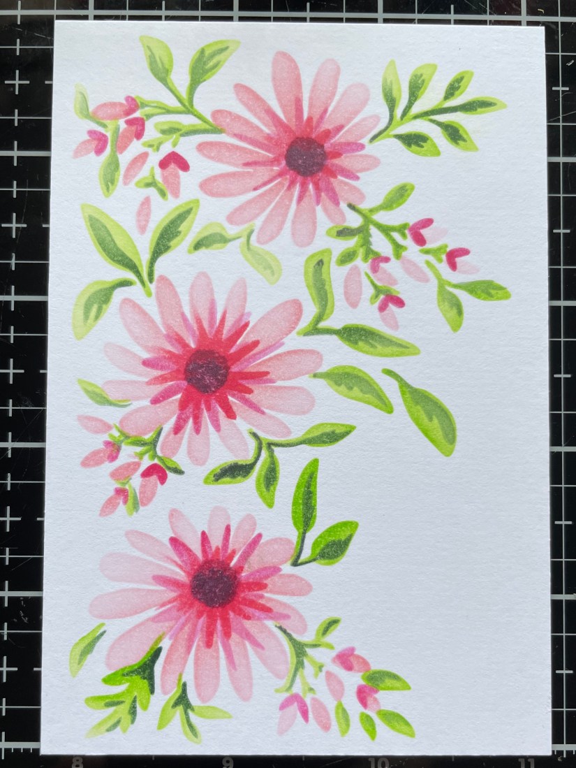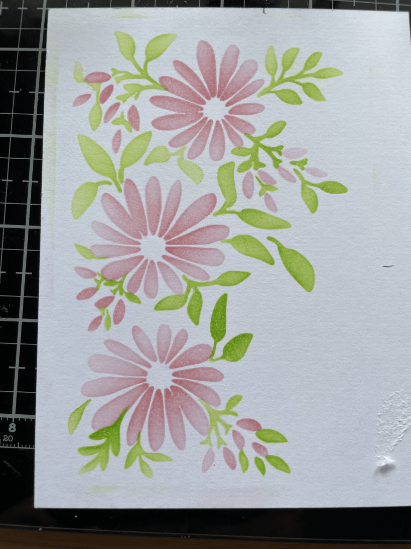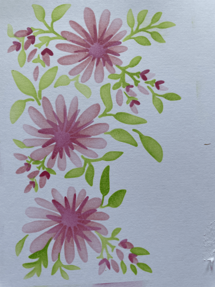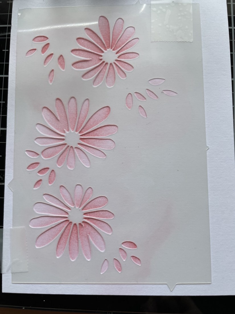 I started with my first layer which you can see below, using archival ink. If you look closely you can see notches around the outside of the stencil, this was to allow for easy matching. Simply add a light pencil mark on your card where the notch is and then match the remaining stencils to that mark.