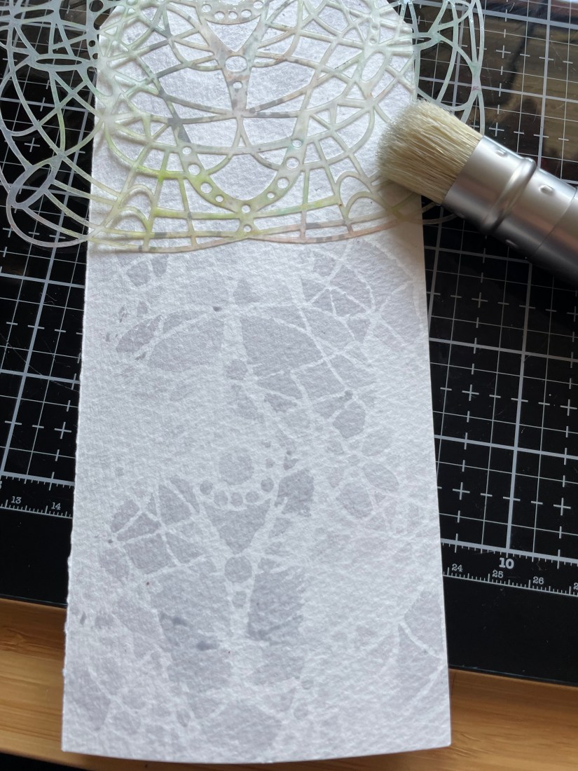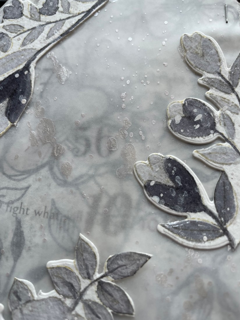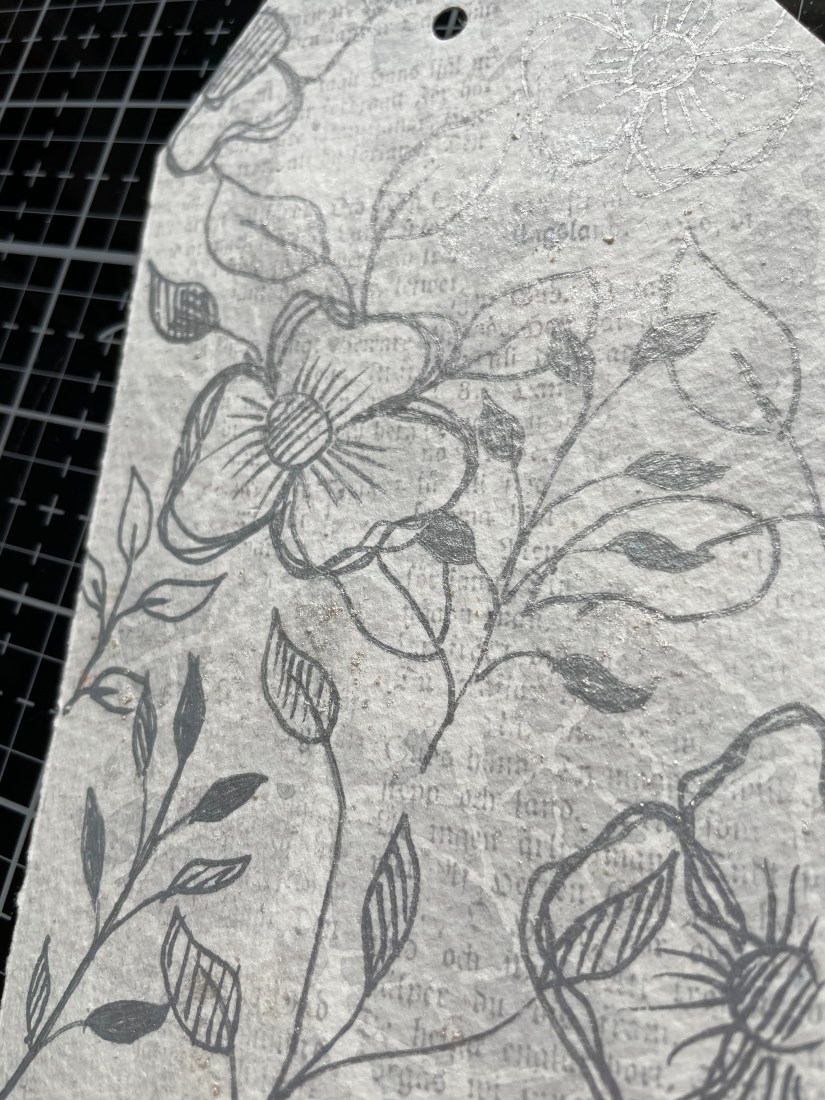Initially my idea was to lay this over some parchment paper attached to the tag, but I didn’t like the effect as it was too heavy and hid the background more than I wanted.