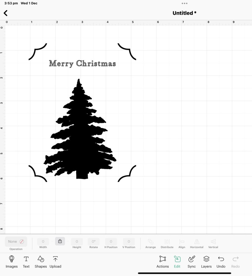 So I started in Design Space with designing the card. I used an image from design space to cut the corner slits which holds the background card, and inserted my tree. I used the fonts to write my the sentiment and converted it to a cut file.