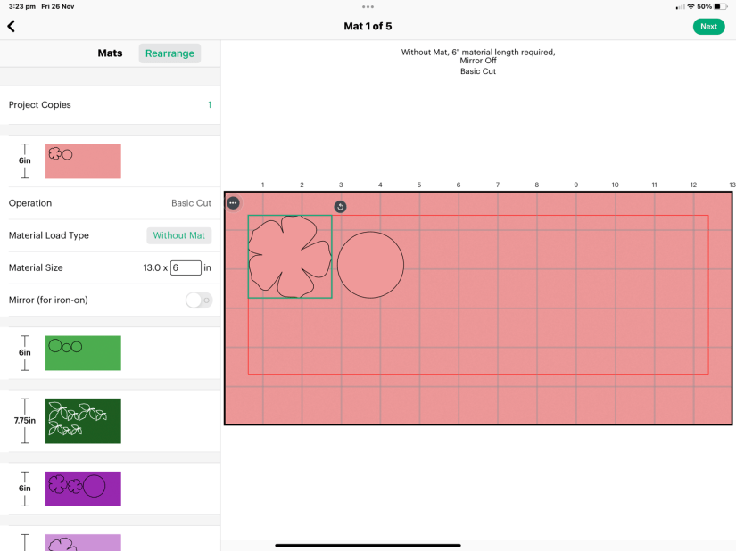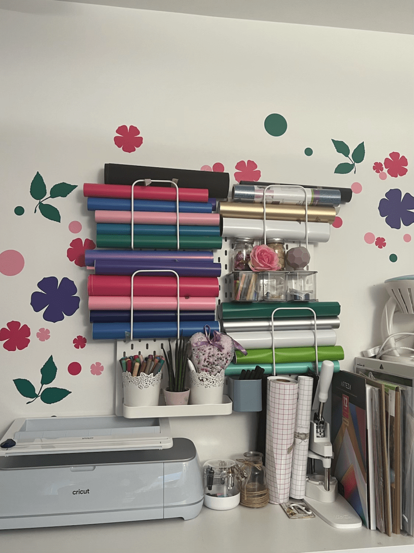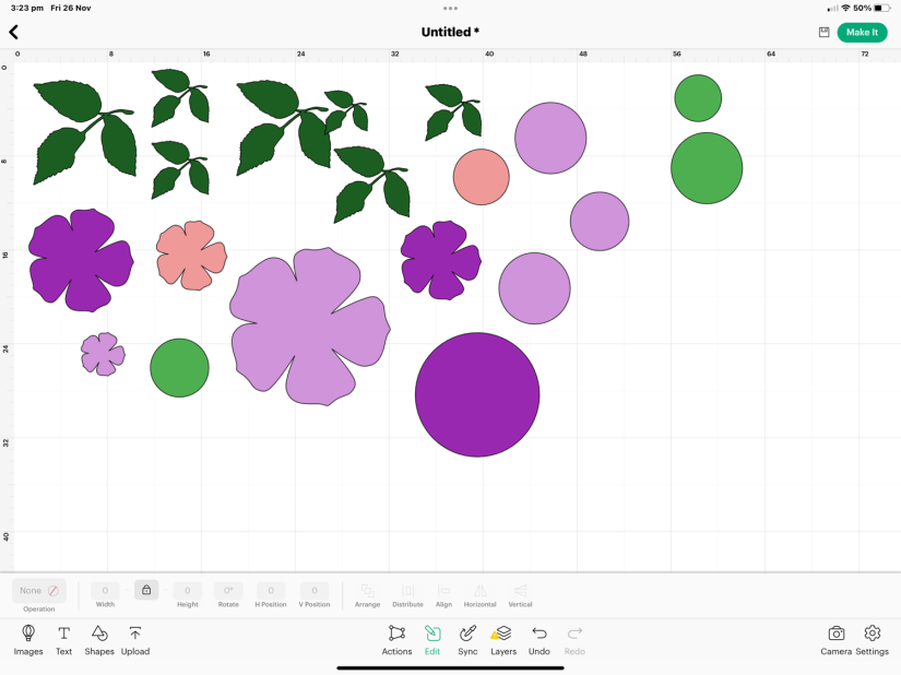 Once in the app I could refine the design by duplicating it for the amount I wanted. I resized some of the images to give variation, I also added some circles using Design Space tools (it has several shapes built in). I changed the colours of the files so that Design Space would sort the different coloured files into separate coloured vinyl. So for example, all the pink elements were grouped together so that once I fed the pink vinyl into the machine it would cut all the pink ones, and like wise the green ones etc.