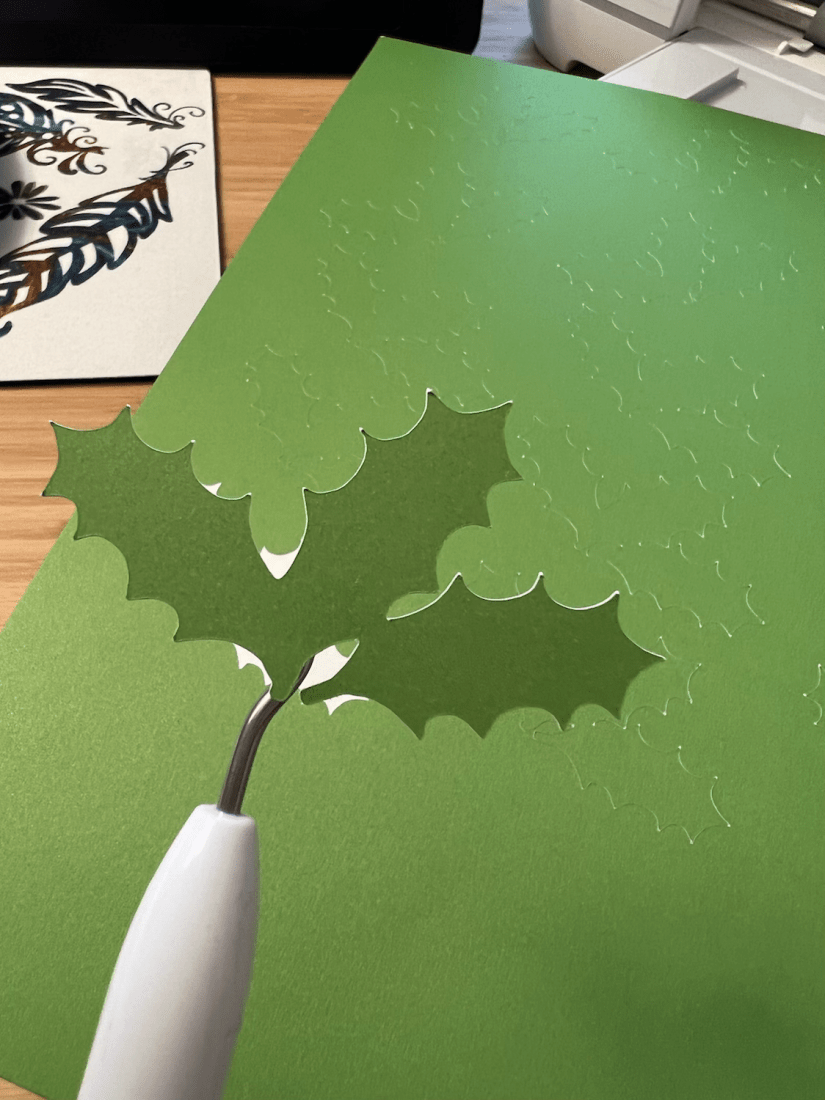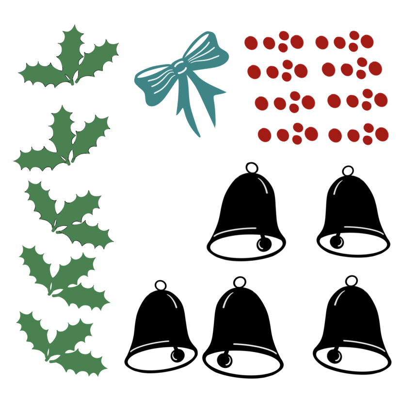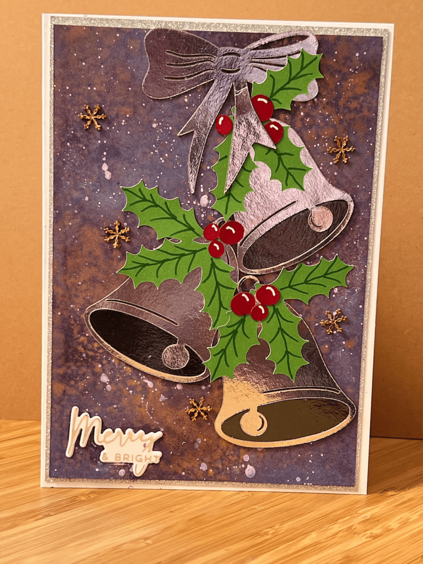 I decided on what colours foil card I wanted to use for the bells, and bow and then plain card for the holly and berries.