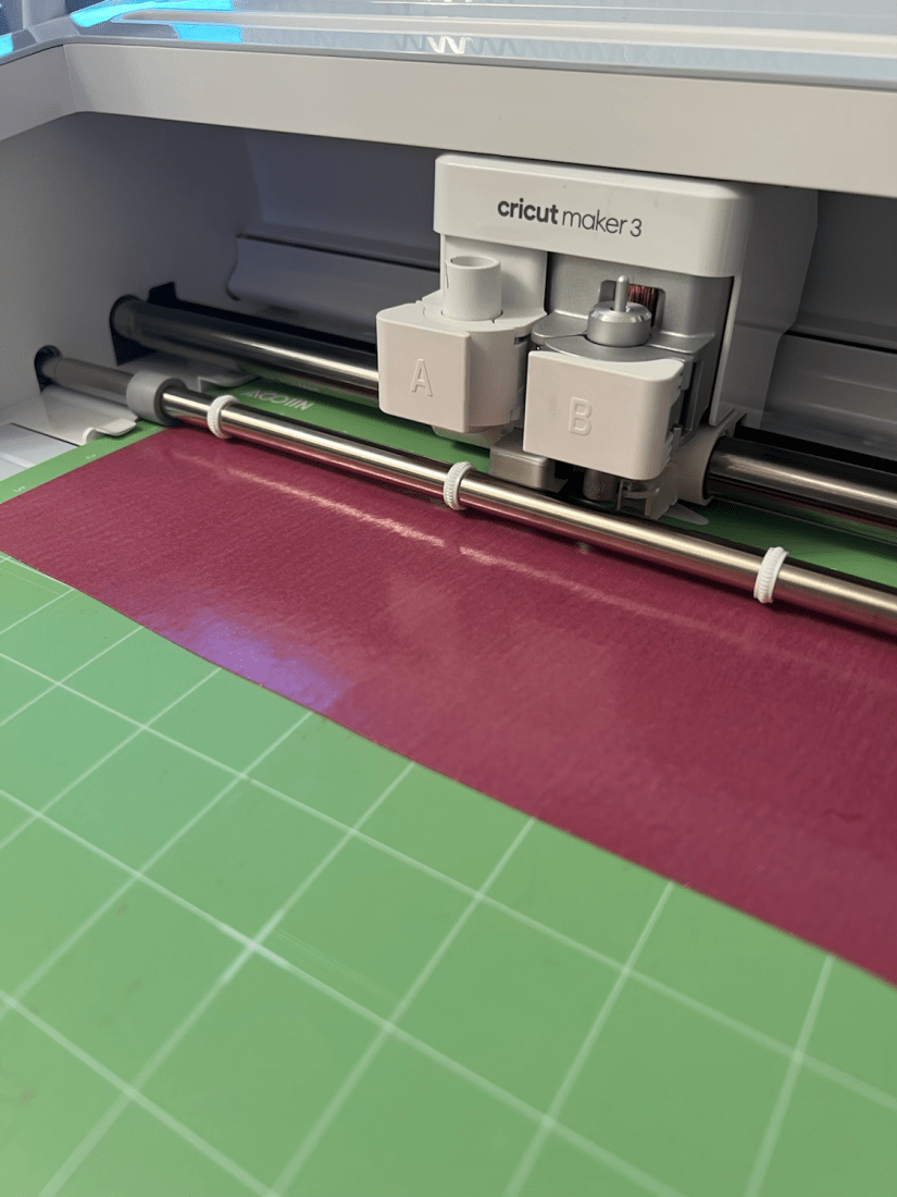 I grouped my sentiment and hearts so that they cut as 1 image removed the tag image and pressed the make it button. I set up the cut with the type of material I was using which was iron glitter and added my vinyl to the mat, feeding it into the machine.