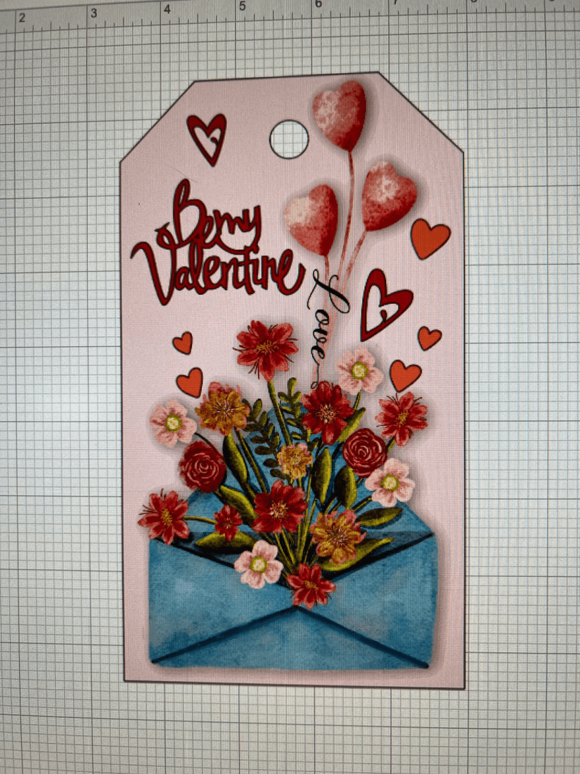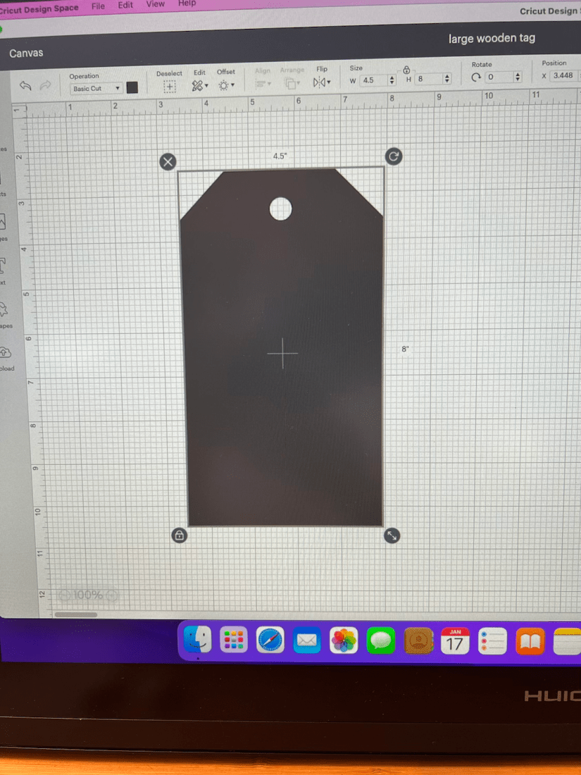 I saved the image as png file which means it doesn’t include the background. This I then imported into Design space And saved as a print and cut file. Opening a new canvas I created a template of my tag, the size is 8”x4.5” this helps me size my image etc.