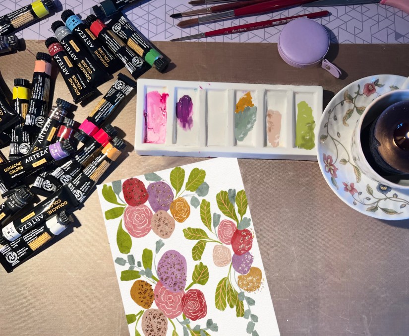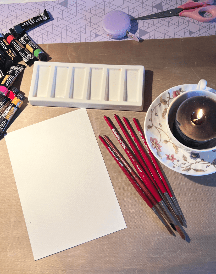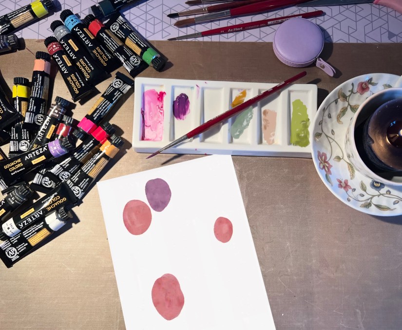 So I set the seen, lit my candle, put on some relaxing music and gathered my supplies. At this point I didn’t know what I was going to do and felt i’d just let the art flow. So I started just laying some blobs of colour down. I mixed up a few colours that I wanted to use and stuck to those colours.
