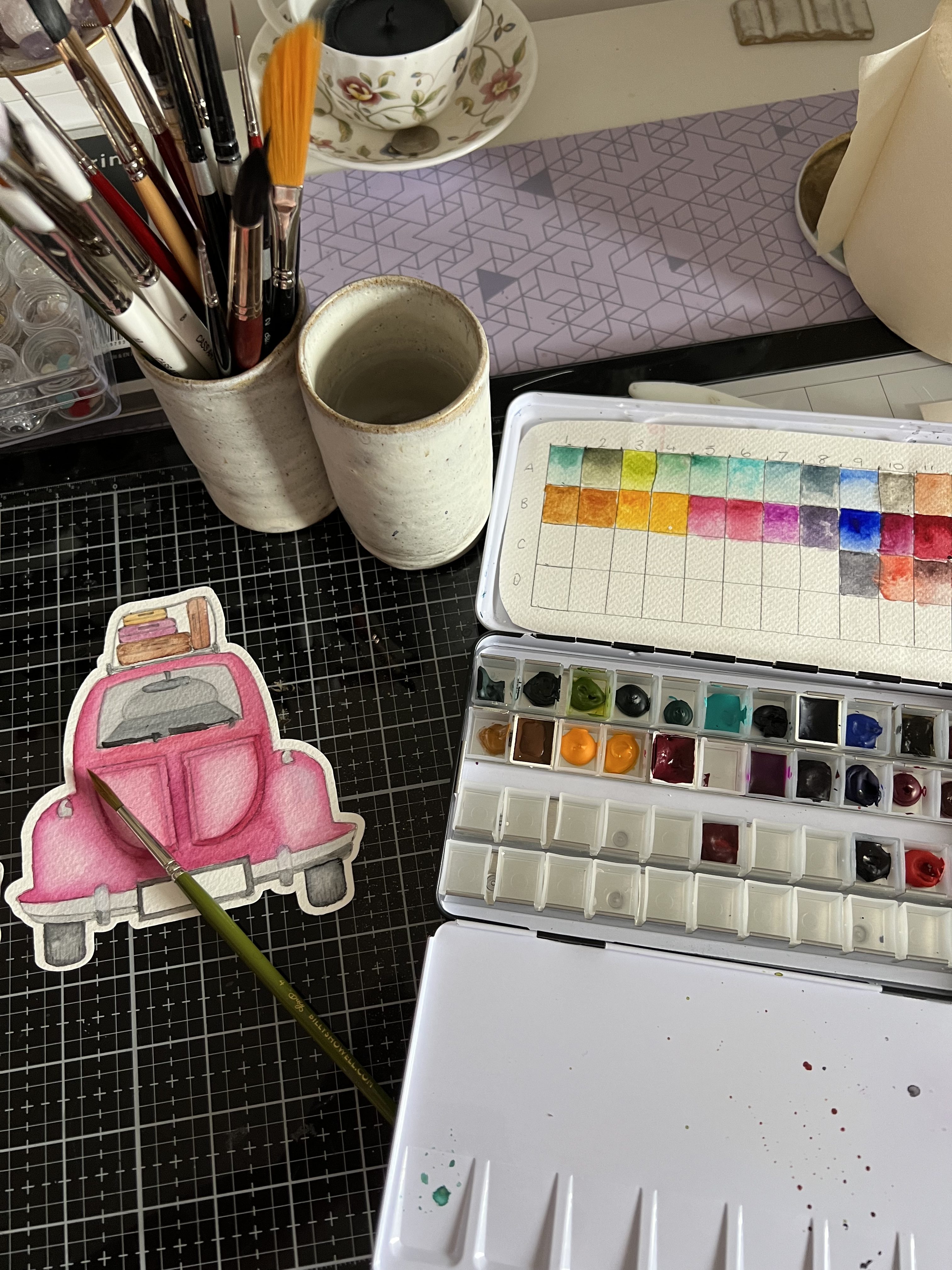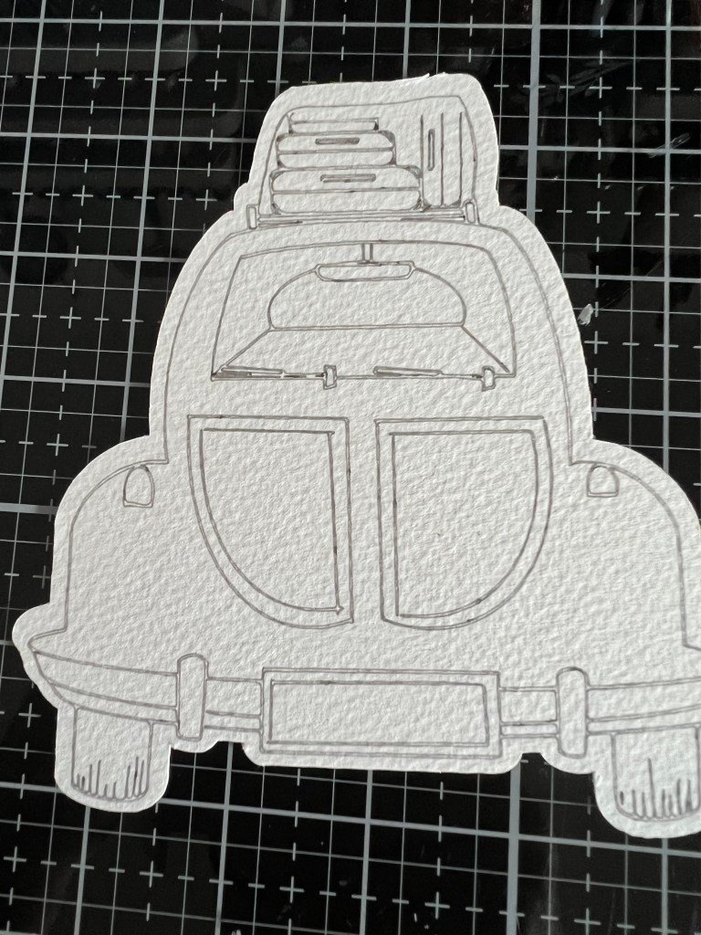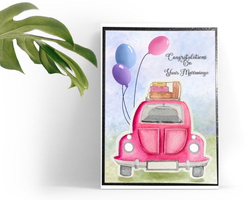 I then added the car, I added a little shading with pencil here and there to finish it off. At this point I noticed I had forgot to add headlights so using Gauche I added them. I also Thought some balloons would look good so added them too. To finish I wrote and cut out a sentiment on my Cricut Joy using adhesive vinyl and secured this in place.