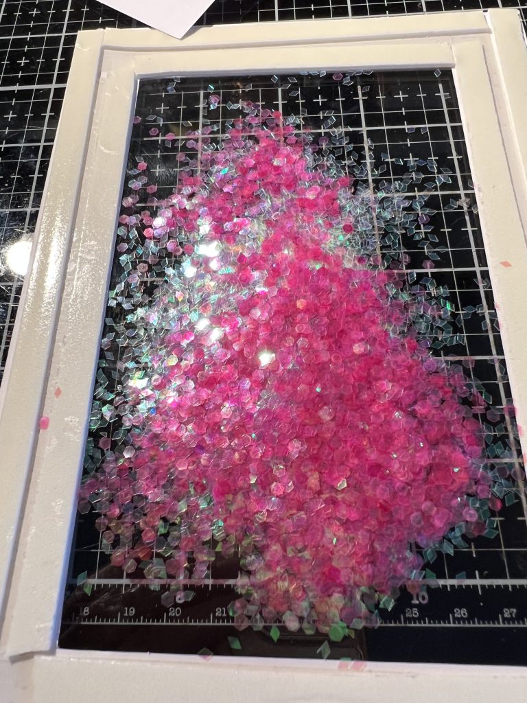 I next cut a piece of acetate to fit the mount of the card and attached it to the back of the mount. I then used double sided foam tape on the inside of the opening, as this would give the sequins room to move. I did the same on the outside of the Fram as that kept the backing sheet i.e. cake image nice and flat.