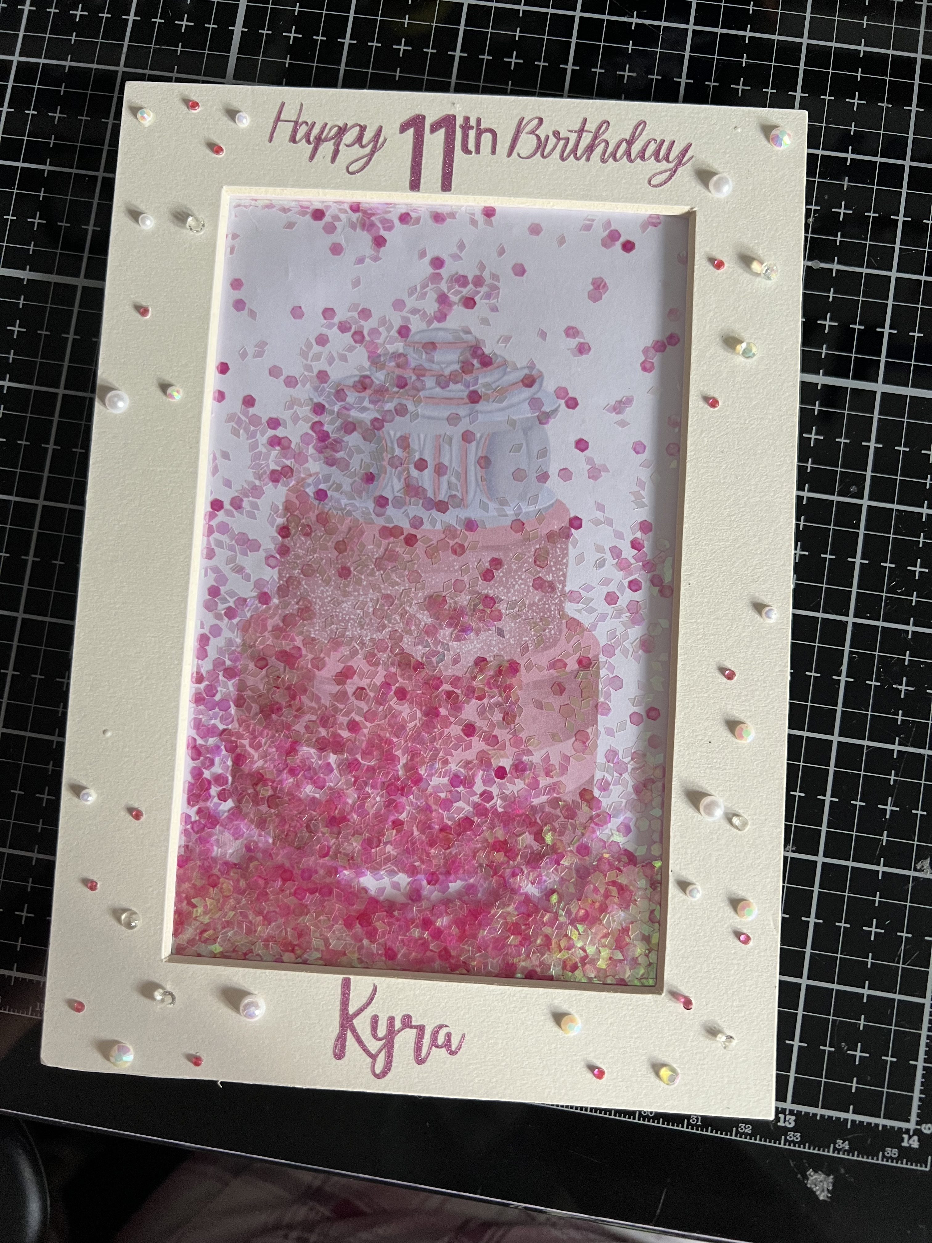 Lastly I cut the sentiment and her name using my Cricut Joy and smart glitter vinyl and added some gems to complicate the rest of the card. for once this looks much better in the flesh than the photos can do credit.