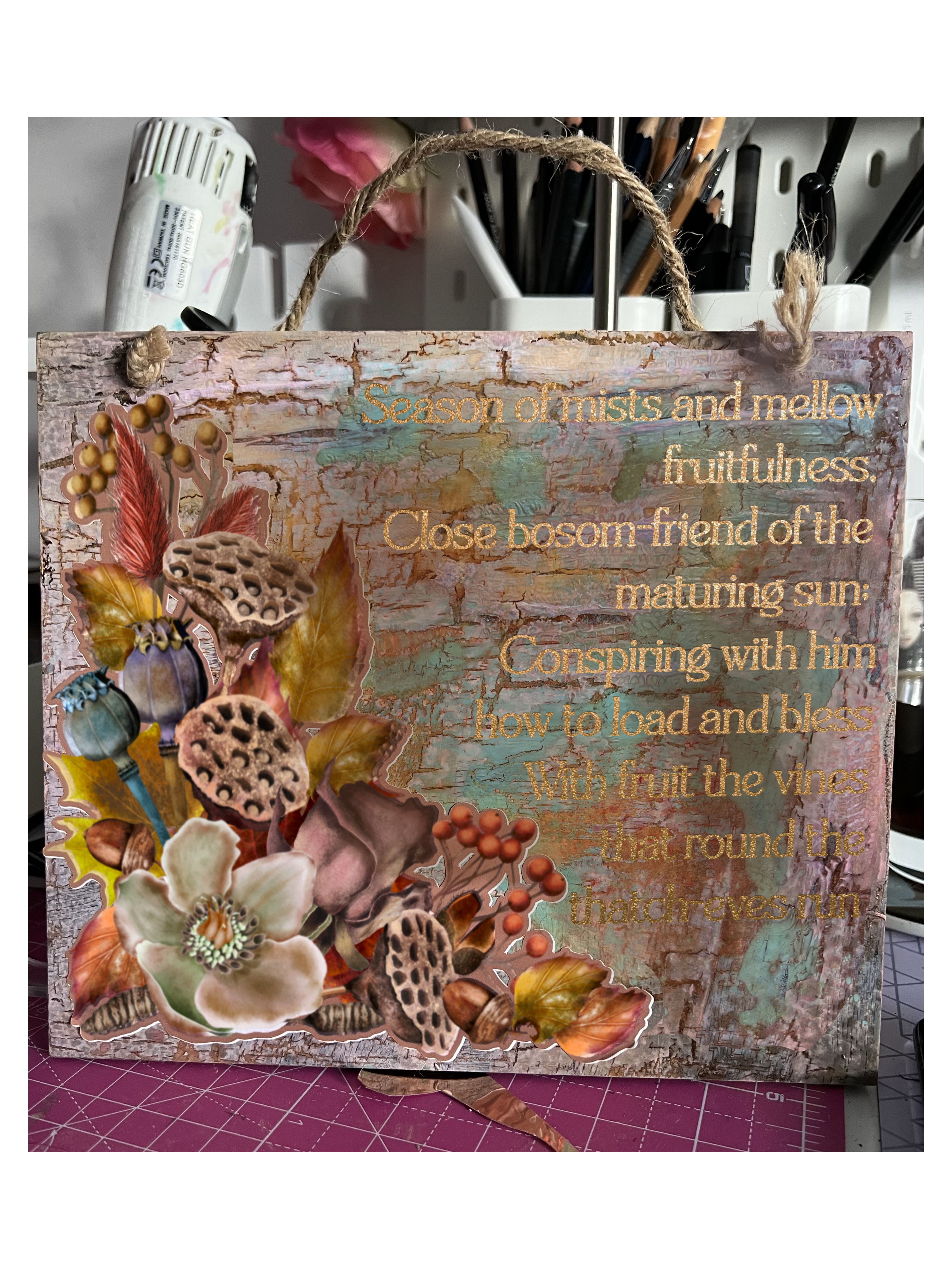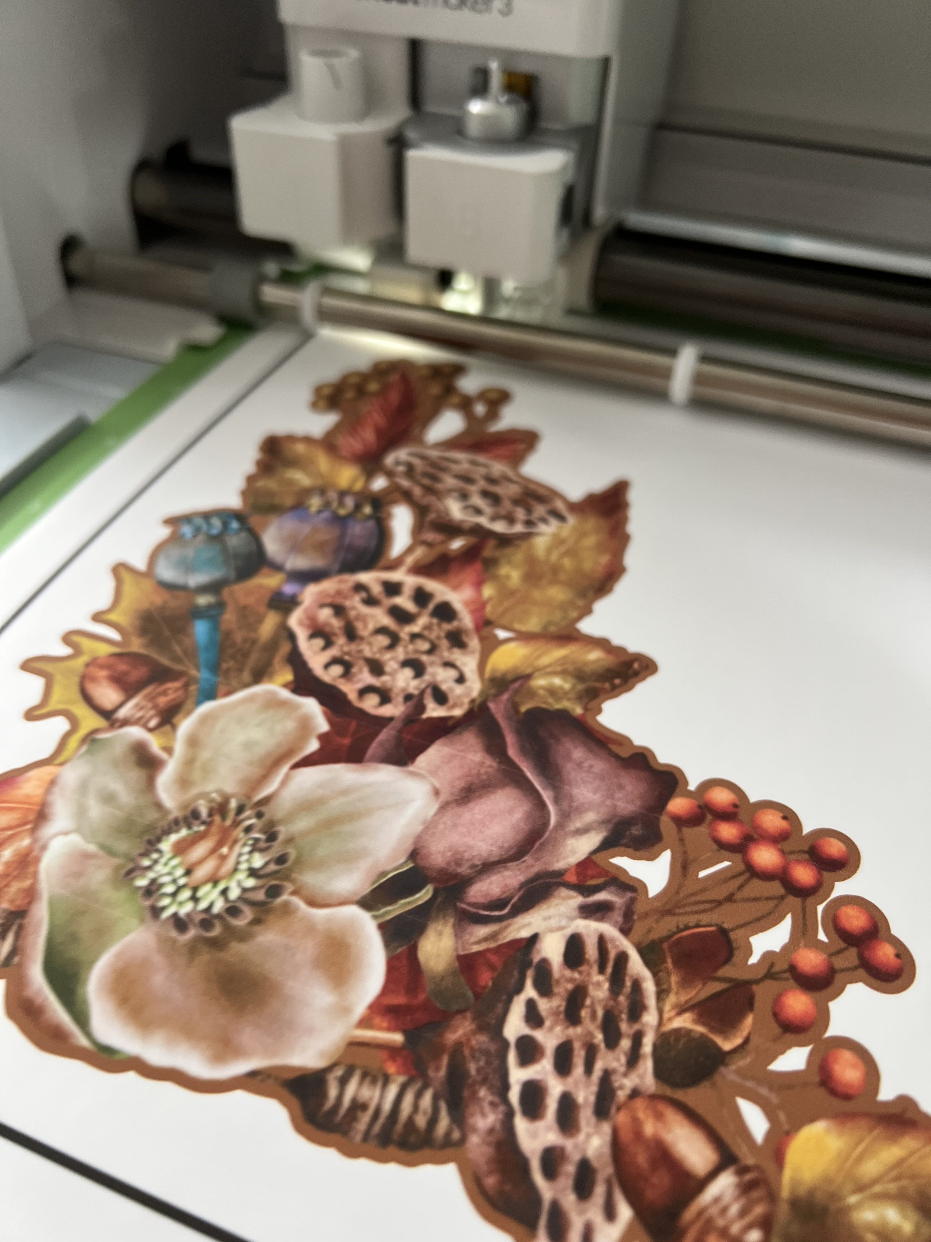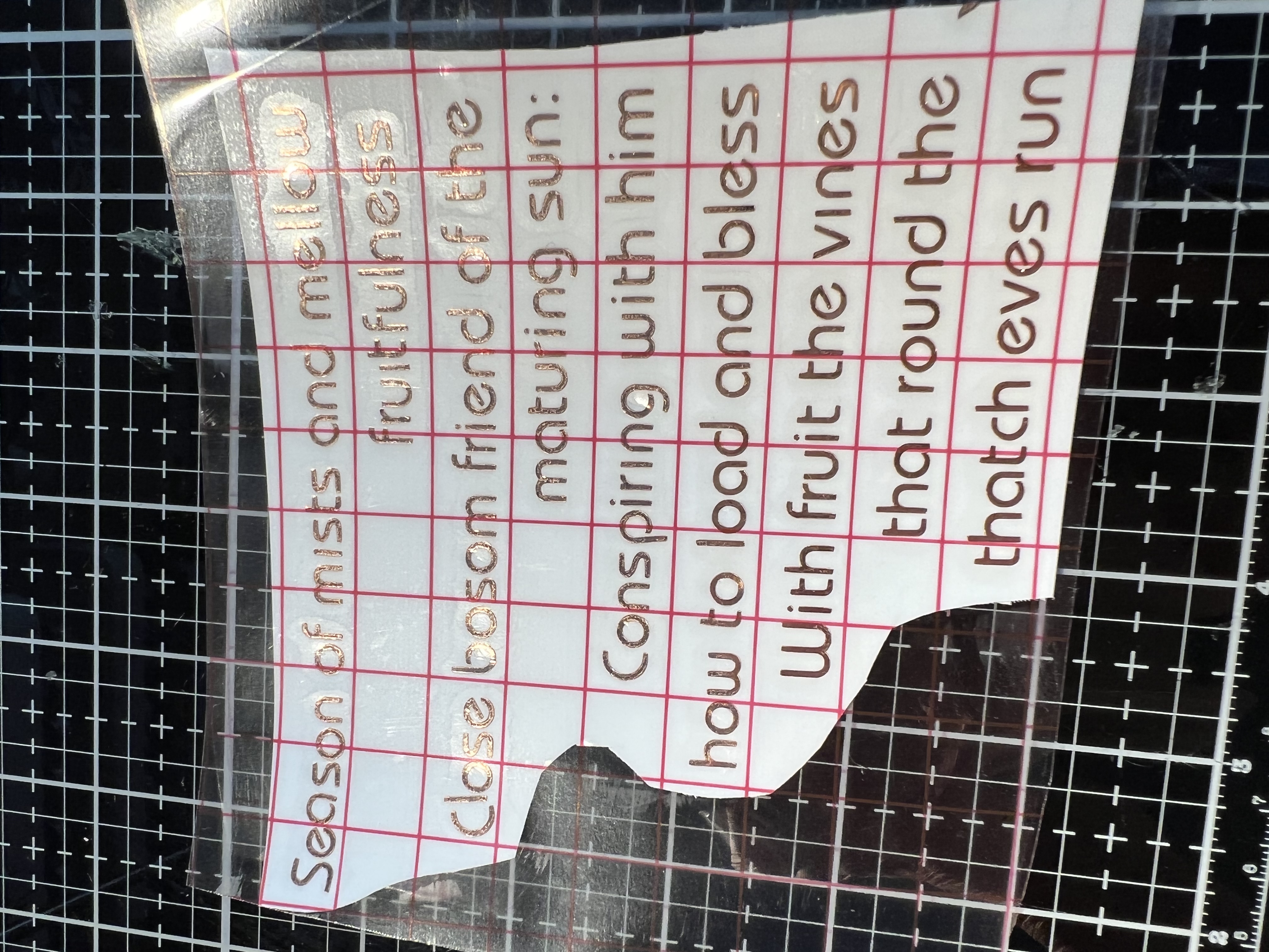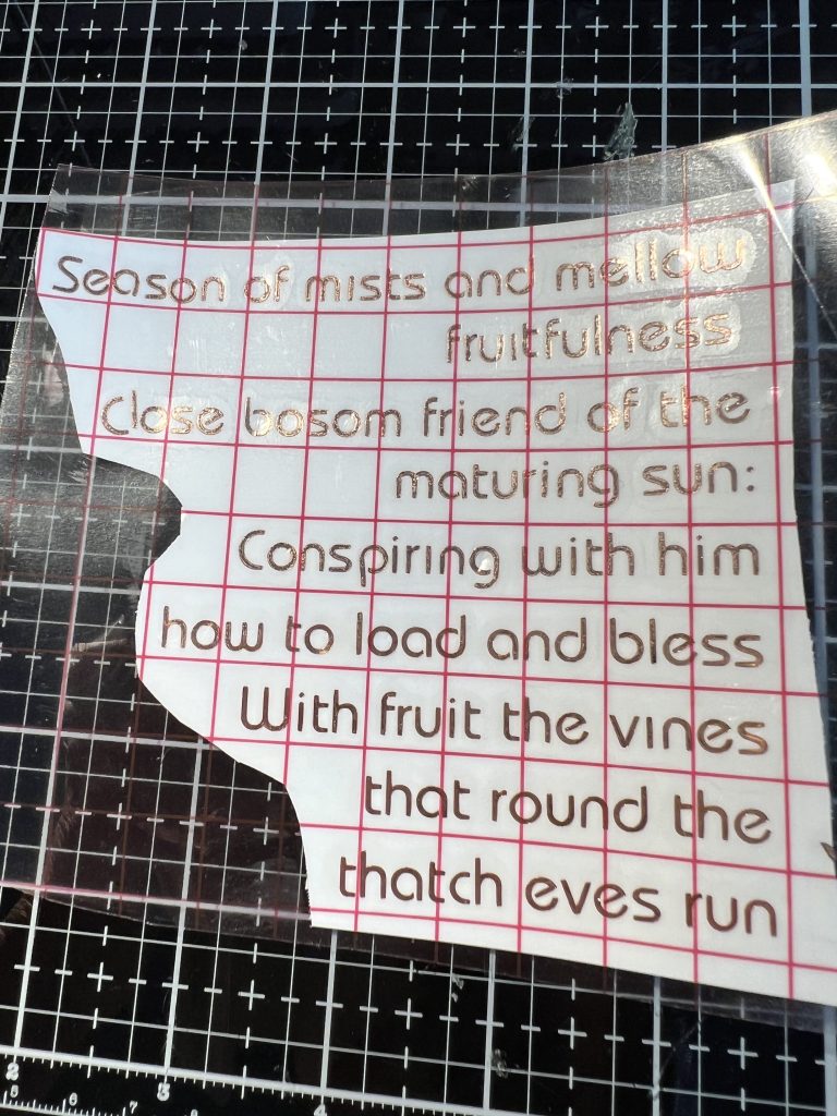 Once I was Happy with the composition I saved It as a png file then sent it to Cricut Design Space. I then Set it up to print and cut. I set an offset around it so that it left a small gap, I printed It on to printable vinyl. Once printed I fed It back into my Maker 3 to cut out the design.I also created what I wanted written to the maker to cut out. This was a real pig getting it sorted. Firstly, weeding the words was a real pain as several letters either moved or stuck themselves to the waste vinyl. Once I sorted that out, I used the wrong transfer sheet, I used a medium contact instead of a strong one which made transferring the words really difficult. I chose The the first few lines from to Autumn from Keats