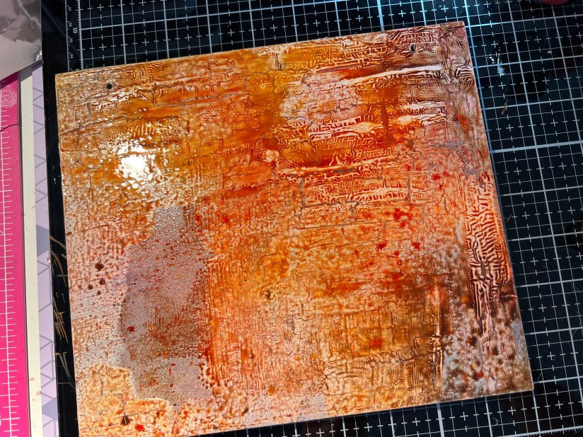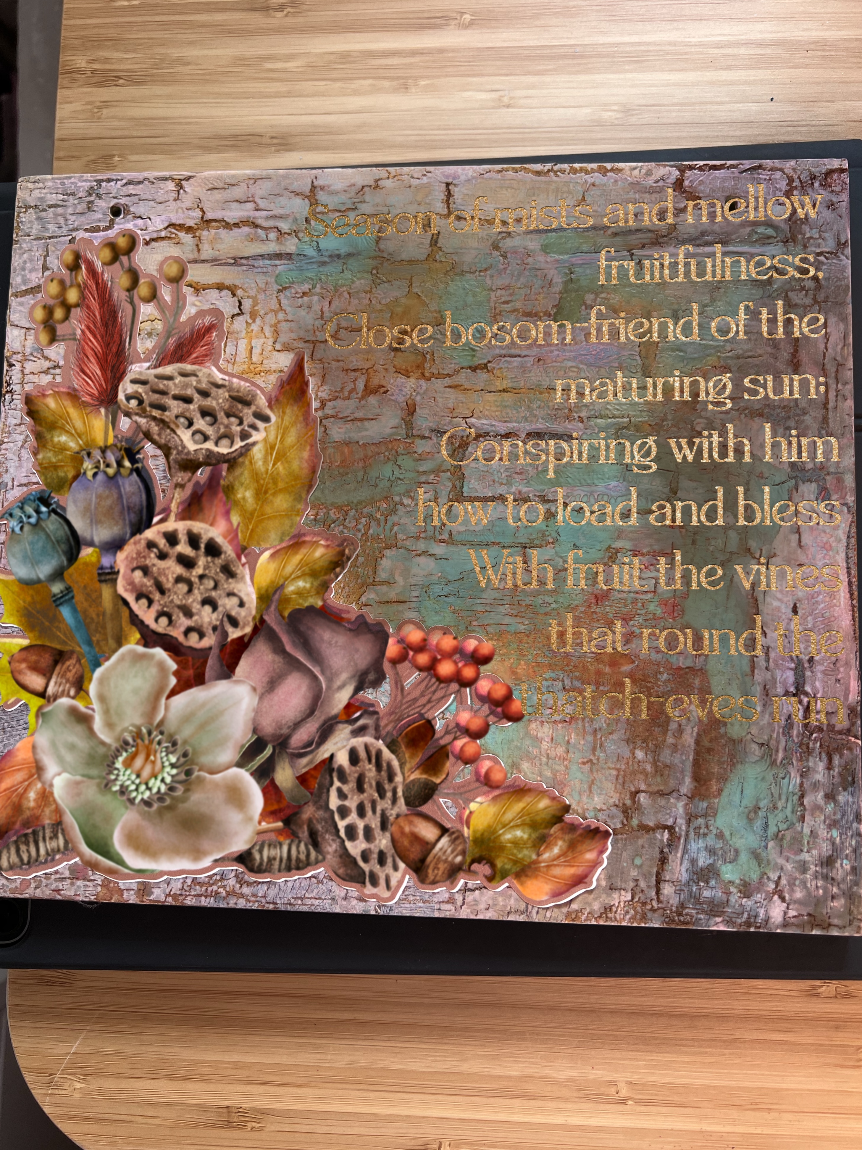 Once completely dry I used several oxide sprays in autumn colours and then dried itwith a heat tool.Once it was completely dry I brought it all together. At first the background was really dark enough but I added Some dark ink the give a bit more depth and help the words pop a little more.