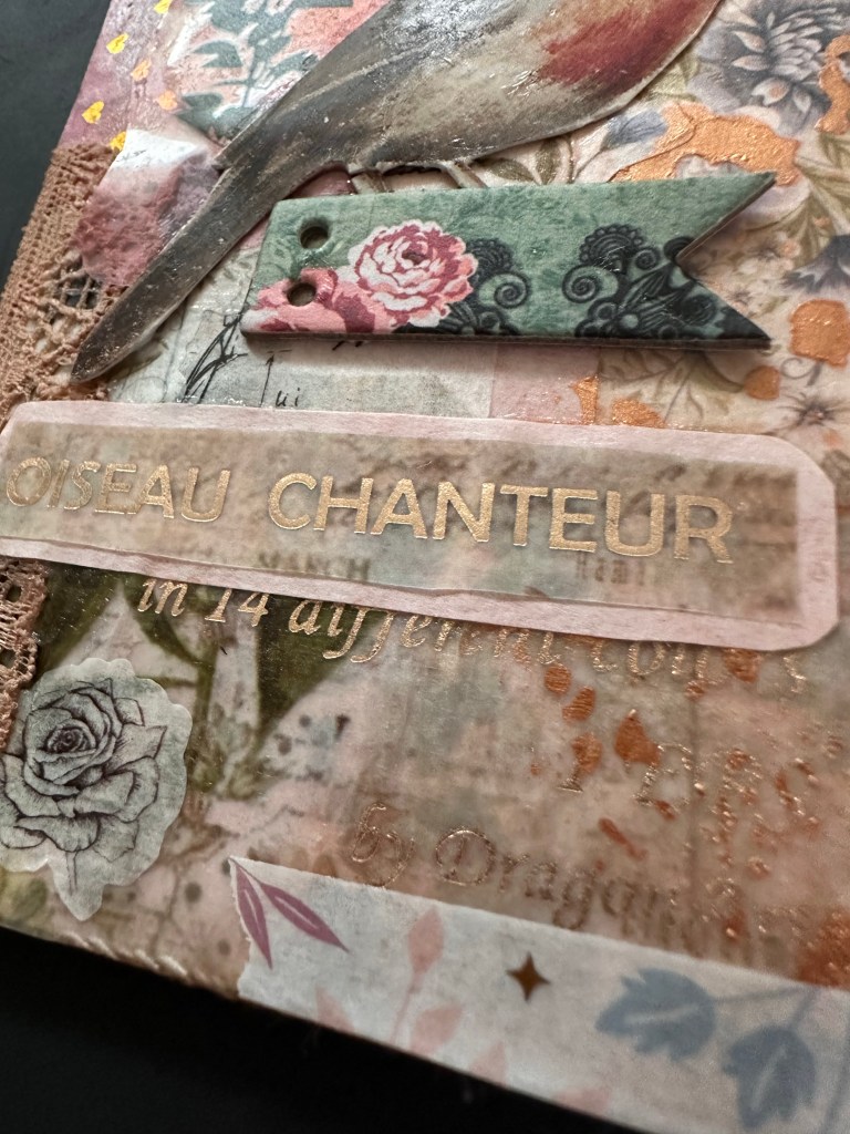 Next I added more ephemera, some lace and then placed my focal point which was the robin. I placed a tiny tag in place but before sticking it down added some cotton. I inked the edge of the robin and then put it in place.