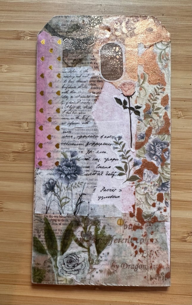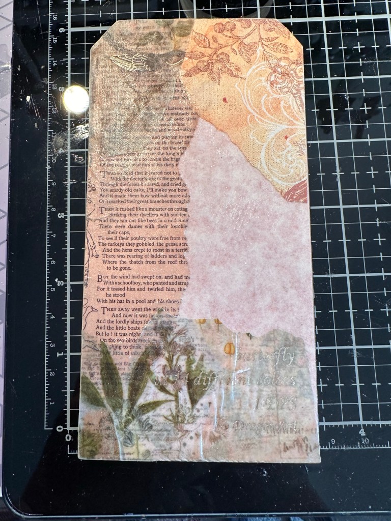 I chose several papers and covered my chipboard #8 sized tag using a heavy Gell medium.