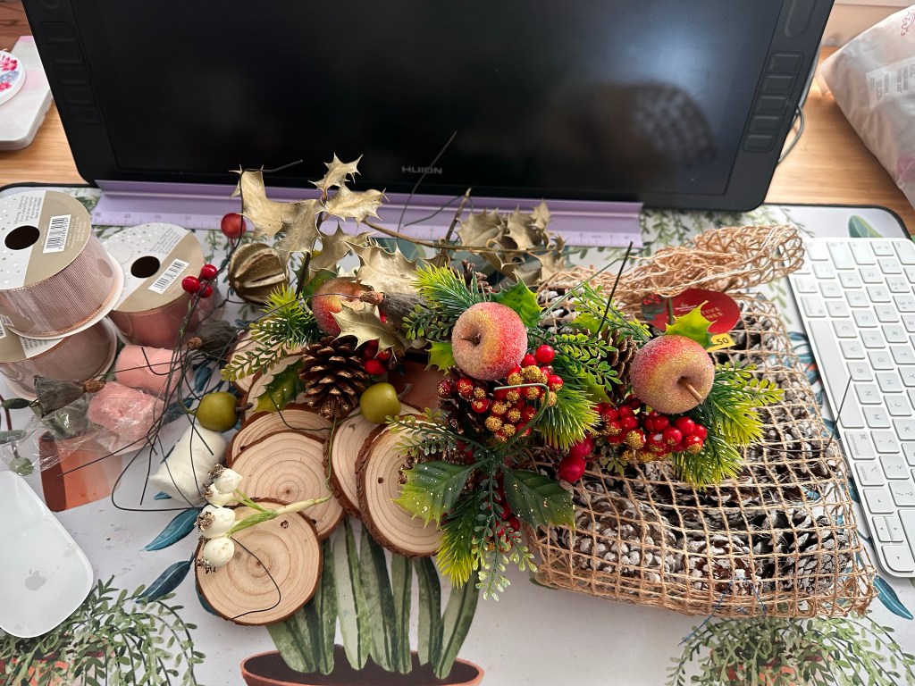 I tried several such as the cones, more flowers, leaves etc, around the wreath but felt it looked best with a single spray st the bottom so that’s what I went with.
