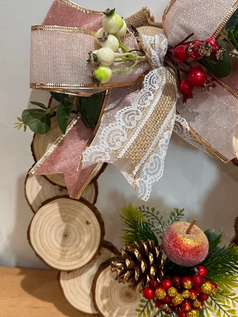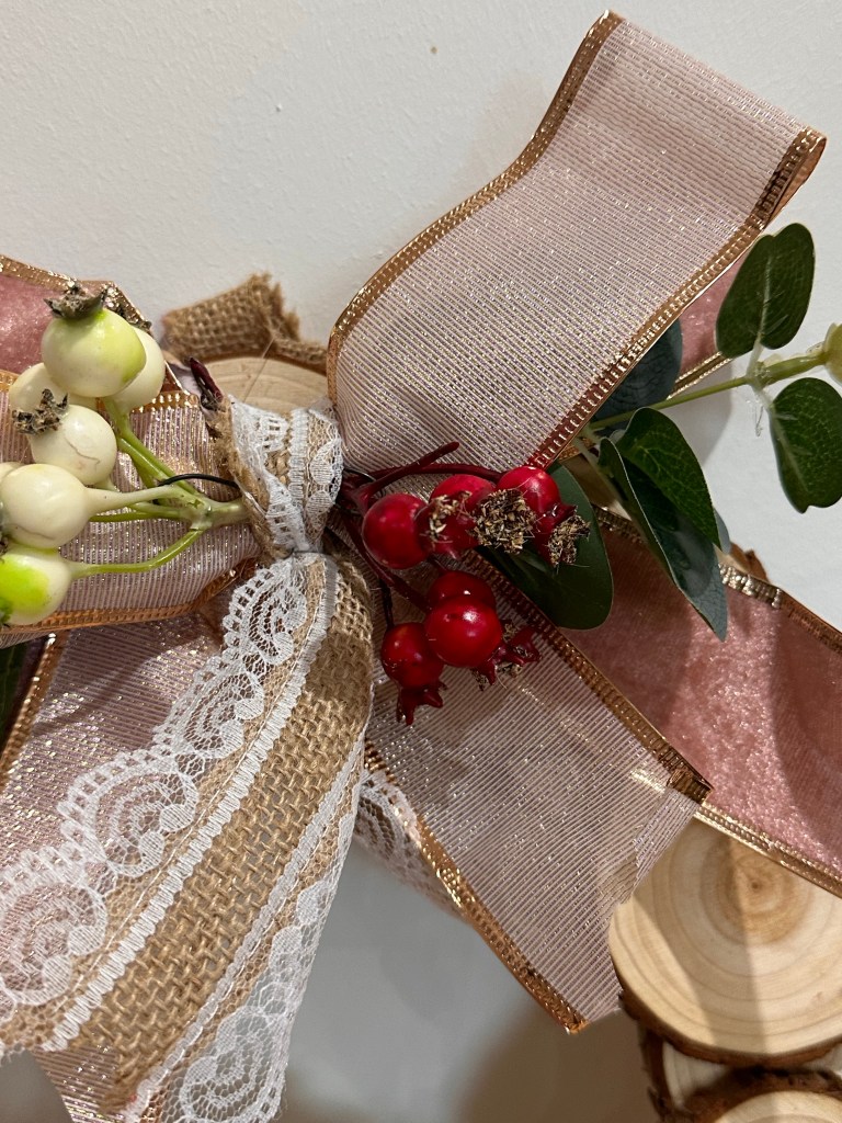 I also knew I wanted to keep it simple so chose some of my glittery ribbon in two styles, one velvet and one chiffon, both with gold edging and wire. I formed large bows and secured with another ribbon made from jute and lace, adding to the rustic feel. I secured this to the top of the wreath and added some berries and leaves. I also secured a hanging tag at the back so it can be hung up.