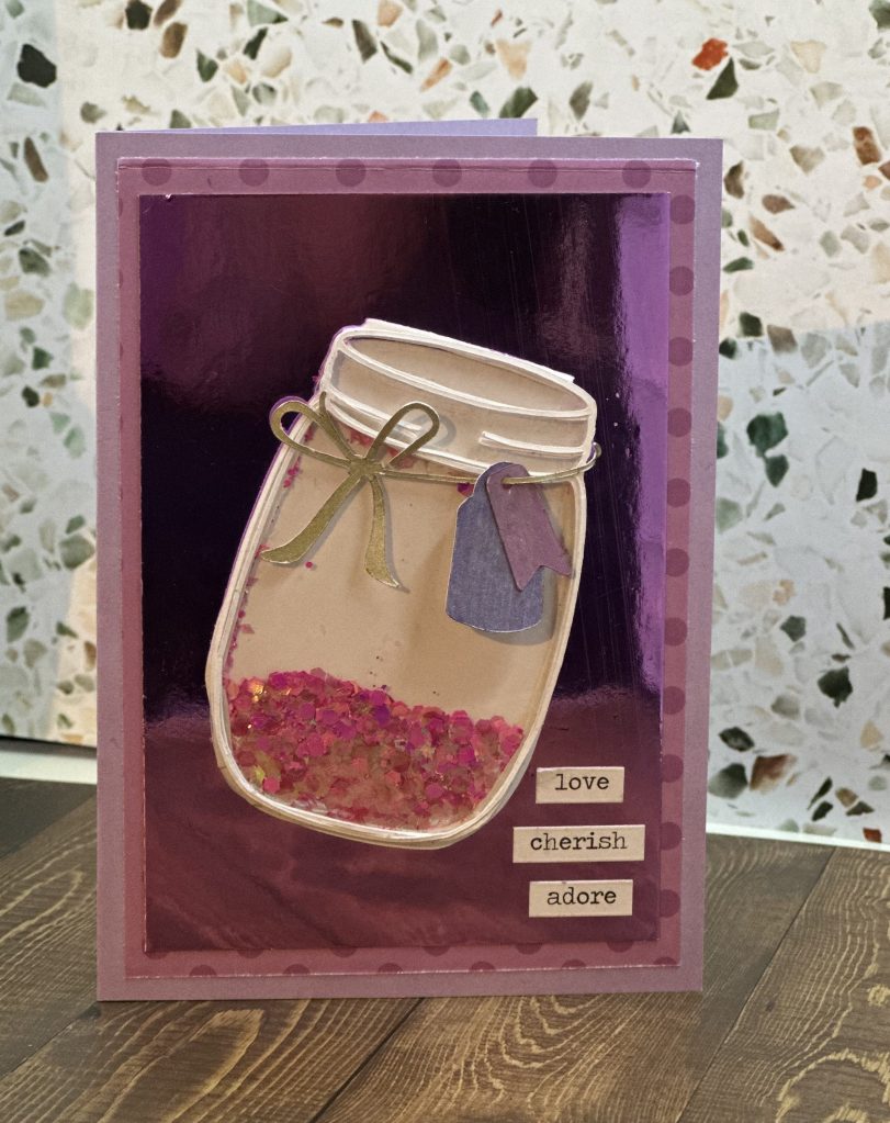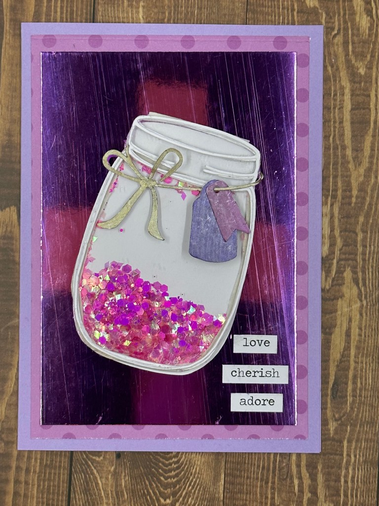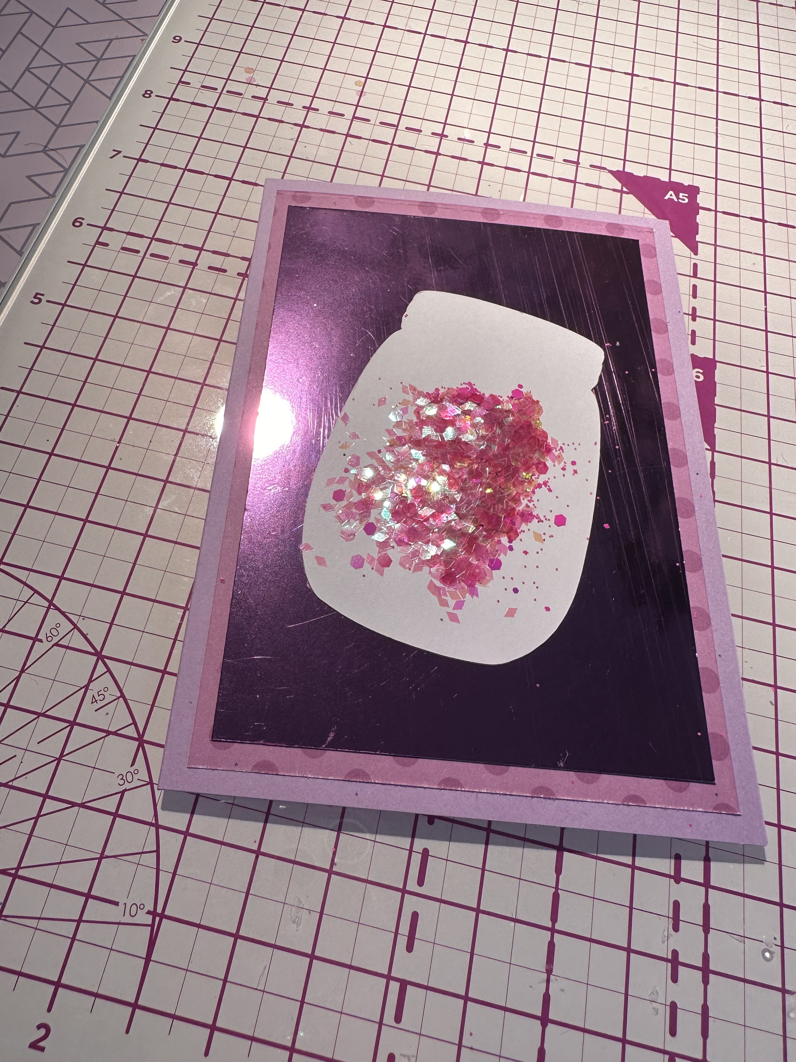 I sprinkled some glitter and sequins into the centre of the jar being careful not to get any at the edges. Then added the outer frame which I had also adhered to the clear acetate. To stick the frame down I used thin strips of foam tape to give a little more dimension to allow movement of the sequins.