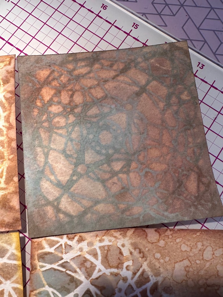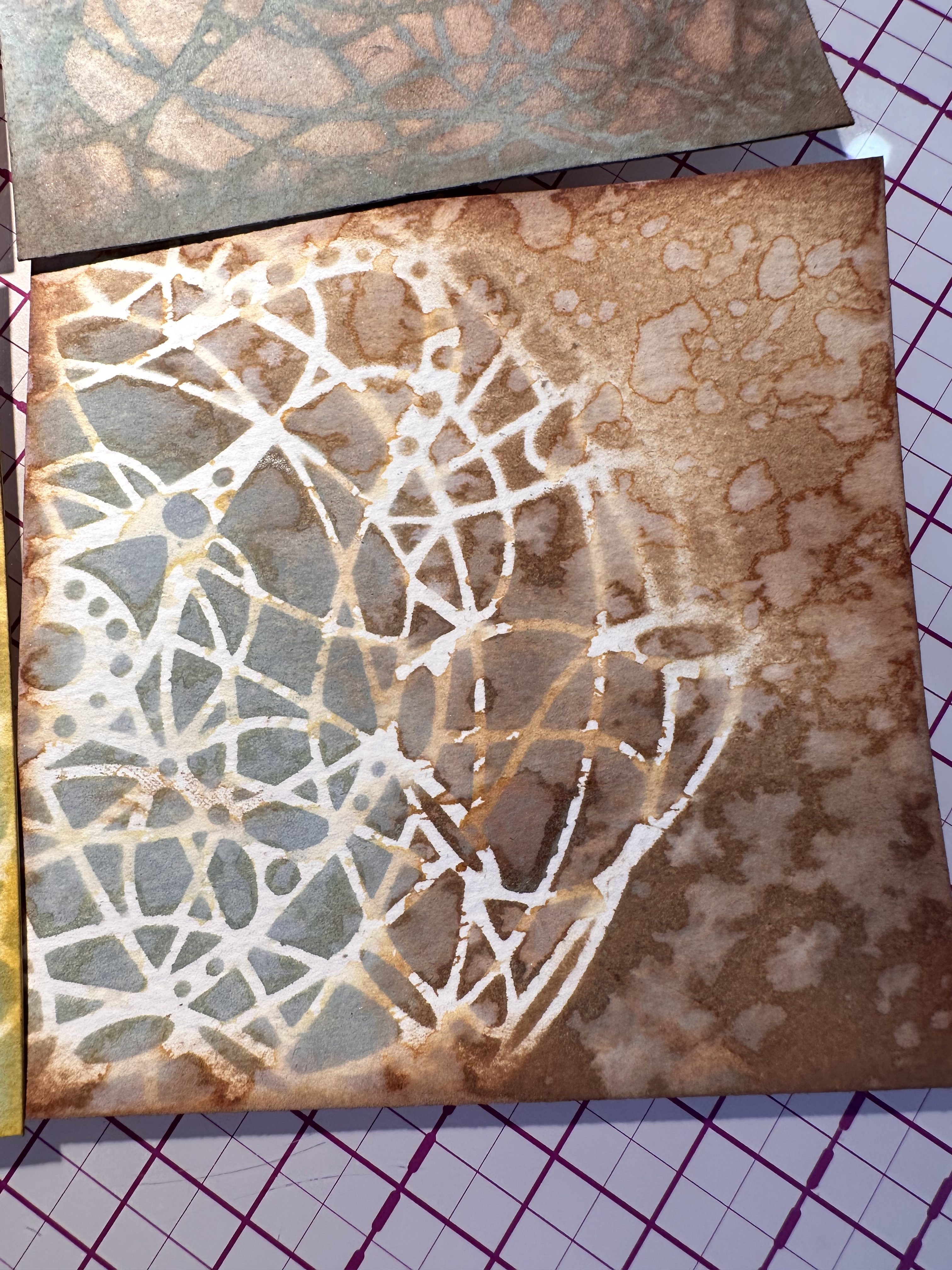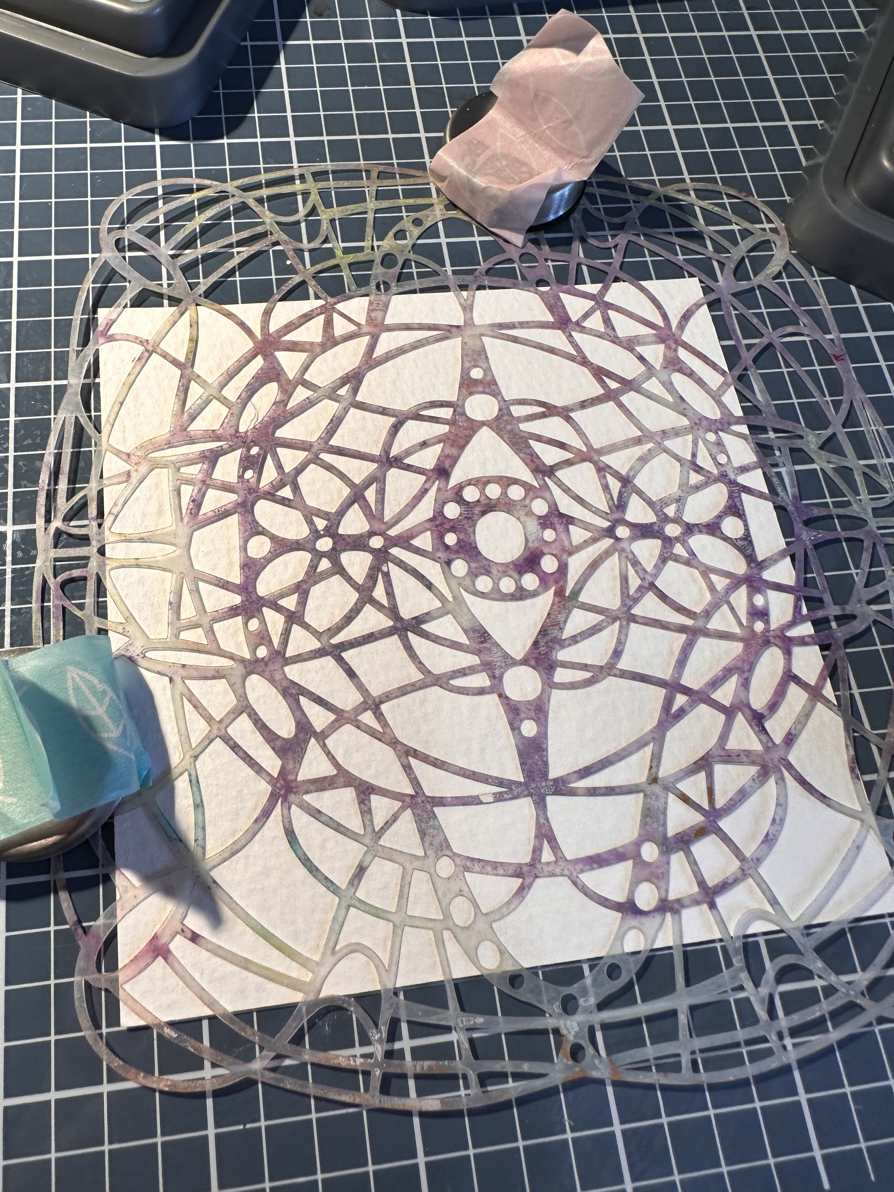 I used a couple of techniques, one I used the stencil taped down so it wouldn’t move and then several oxide colours blended over the stencil leaving the white background.