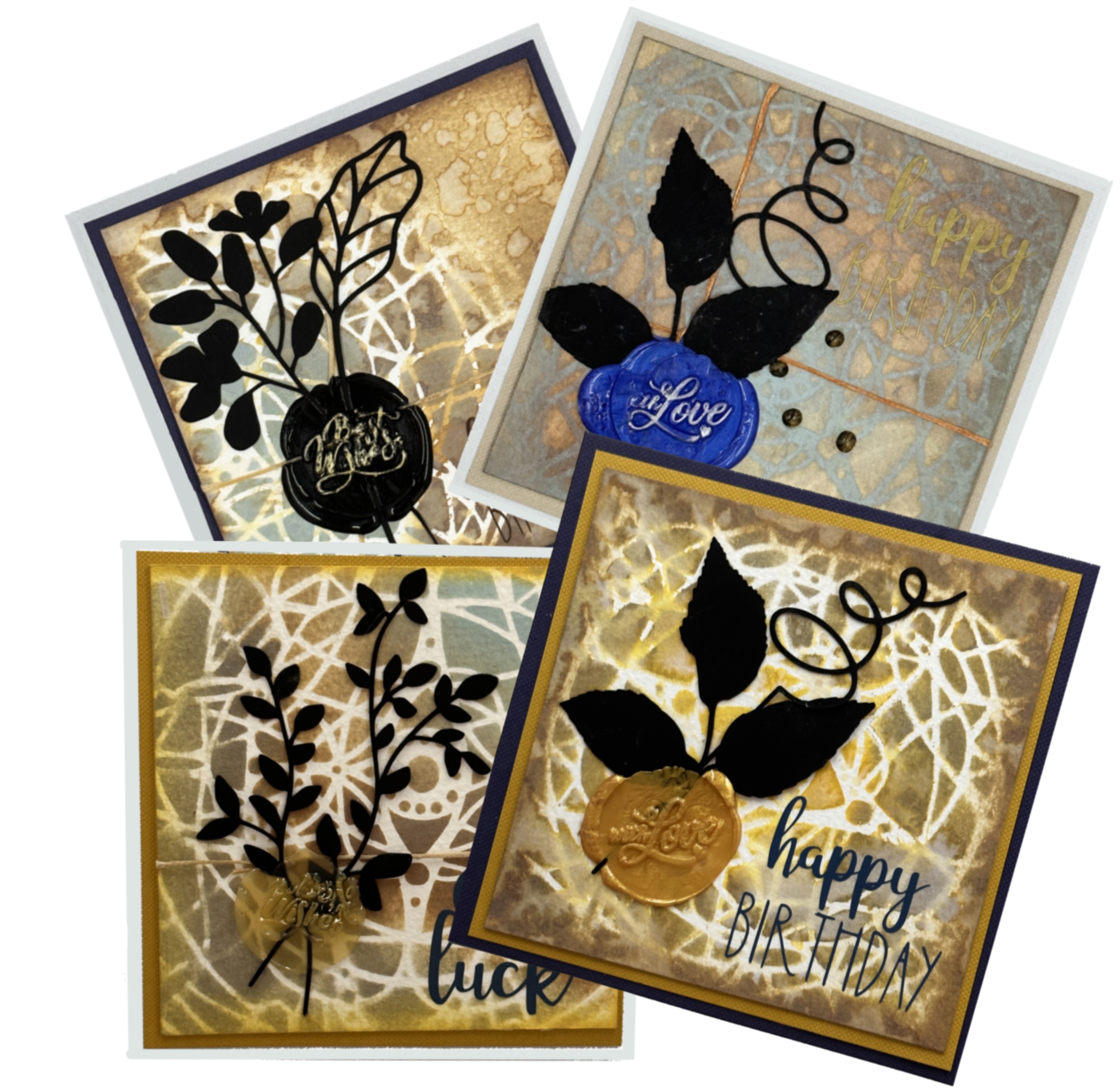 So I used The same die cuts as before, but with different backgrounds. To see how I made the die cuts and wax seals please see previous post here.