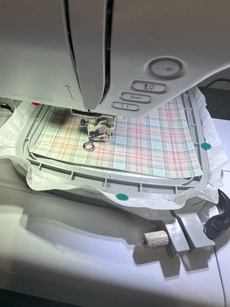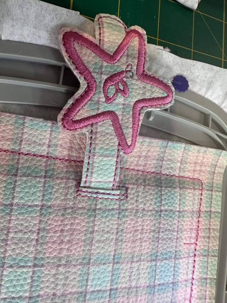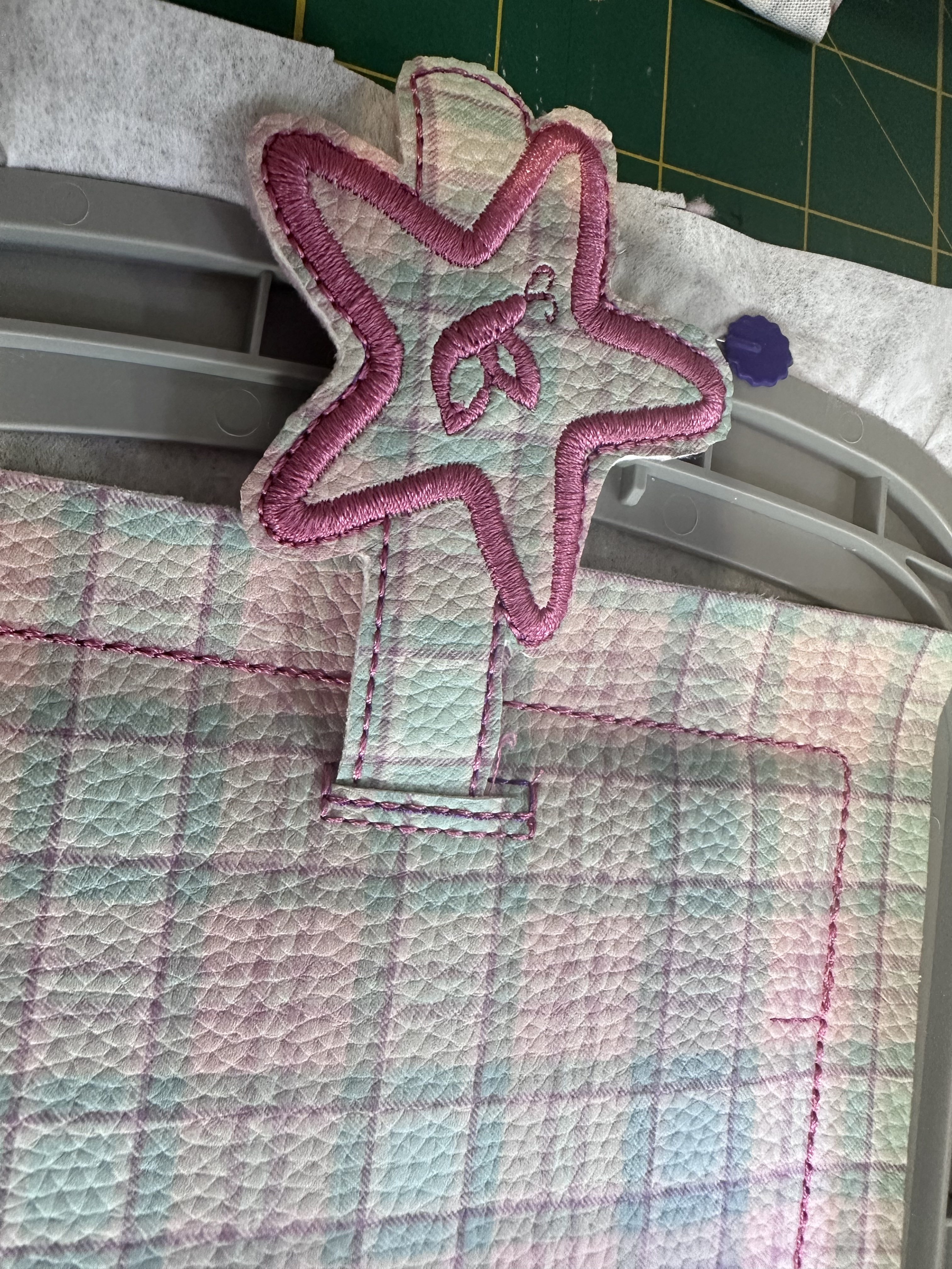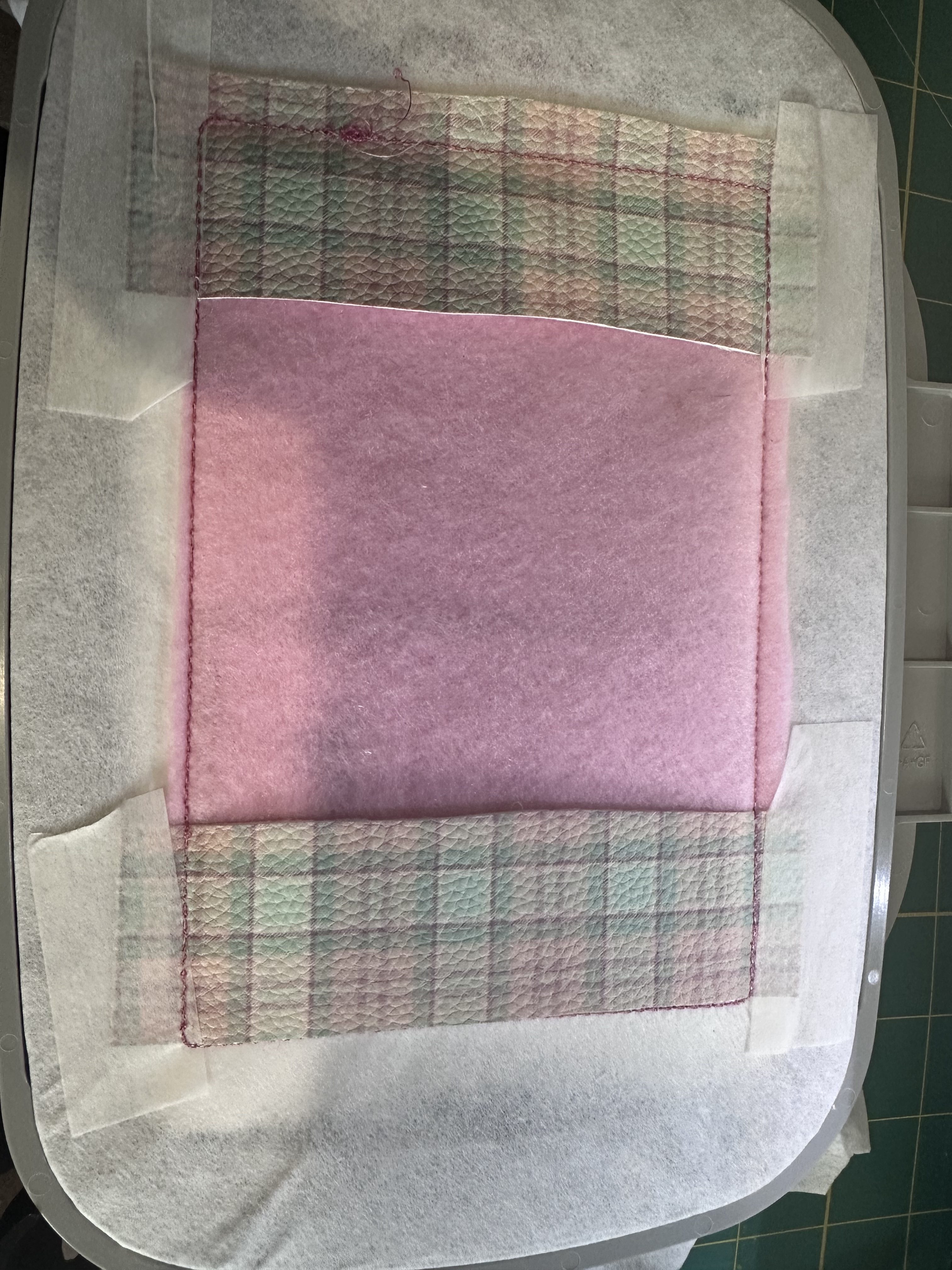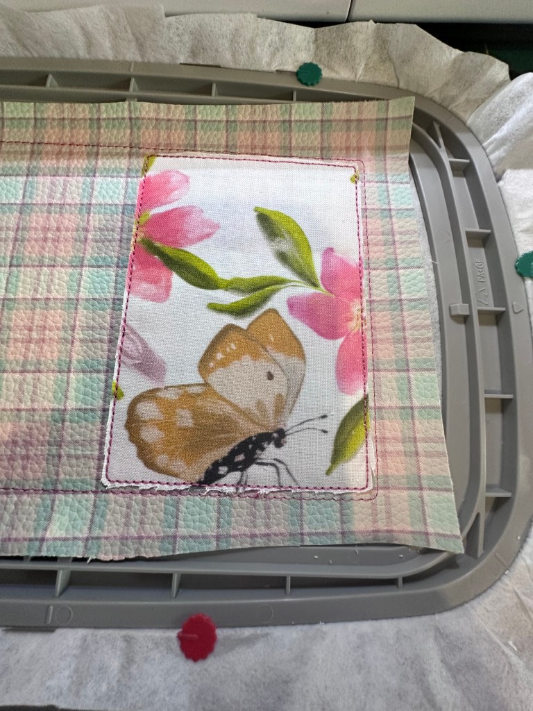 This is the project in the hoop, it has stitched my placement stitch and is now stitching around the edge. I used a faux leather for this part