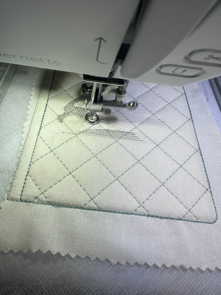 so I chose my fabrics and cut each piece to size. I loaded up my 6×10 hoop with water soluble stabiliser and stitched my first placement stitch. I wont give you all the  details from the pattern as it’s a purchased pattern. However, here are a few shots of it being made.
