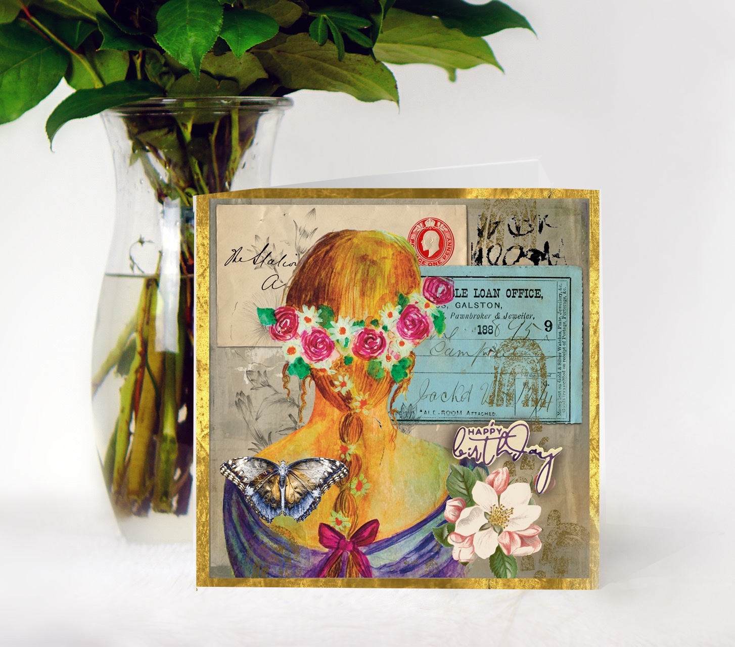 I stuck The ephemera down and then did some light stamping with some background stamps I had hand carved. Added the focal point and added the butterfly and floral element overlapping. I had some sentiments left over from a previous hot foiling session so added a birthday one to finish off. I have someone in mind for this card who just loves the vintage look. To finish it off I mounted my page onto foil card and then attached it to the card.
