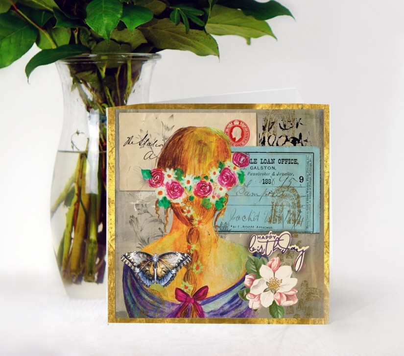 I dont have any process shots for you this month as basically I got so carried away I forgot. I’ll talk you through what what I did however. First I chose to do a 6×6 card and then gathered my ephemera. I started with a piece of vintage paper as a base.  I knew I wanted to use this painting I did a while back as my focal point so printed her and cut her to size and then cut her out. I then chose the elements to go around her.
